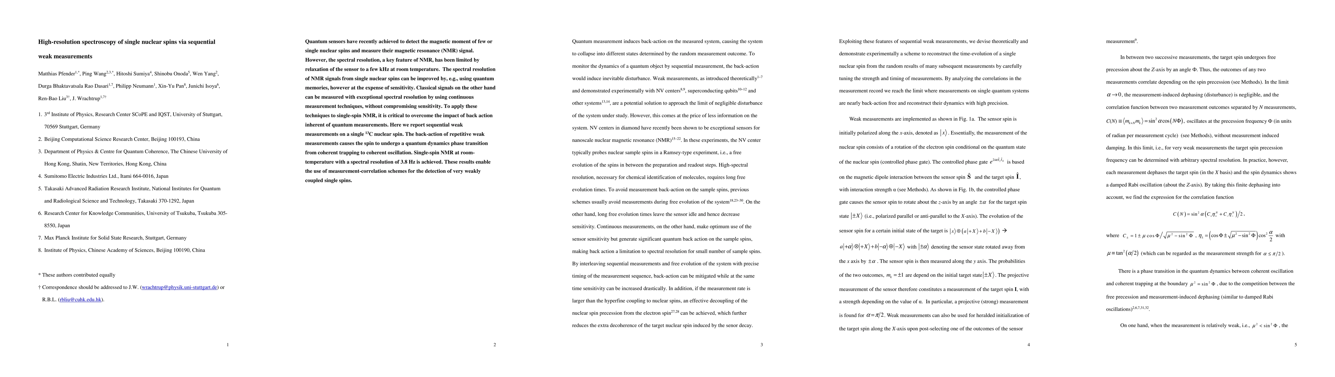 This paper reports the use of sequential weak measurements to achieve high-resolution spectroscopy of single nuclear spins, overcoming back action and achieving a spectral resolution of 3.8 Hz at room temperature, enabling detection of weakly coupled spins.