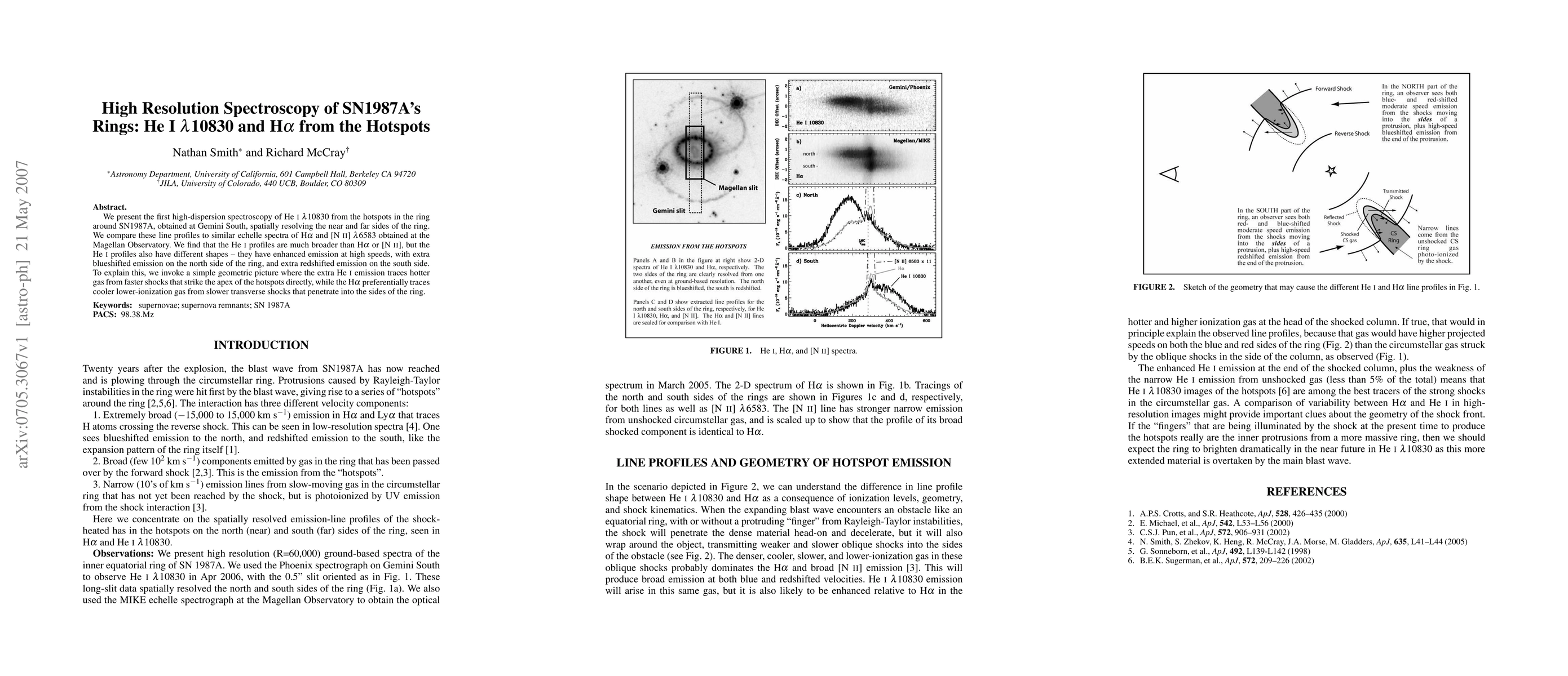 Researchers used high-dispersion spectroscopy to study SN1987A's ring, finding He I 10830 emission lines with unique shapes and locations, suggesting hotter gas from shocks striking the hotspots.