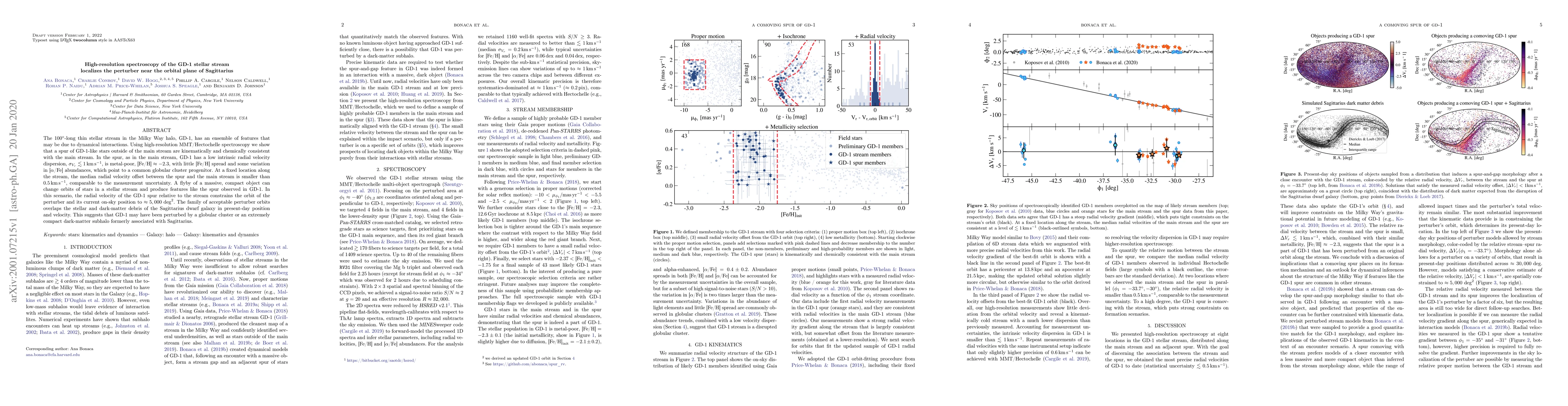 The $100^\circ$-long thin stellar stream in the Milky Way halo, GD-1, has an ensemble of features that may be due to dynamical interactions. Using high-resolution MMT/Hectochelle spectroscopy we show that a spur of GD-1-like stars outside of the main stream are kinematically and chemically consistent with the main stream. In the spur, as in the main stream, GD-1 has a low intrinsic radial velocity dispersion, $\sigma_{V_r}\lesssim1\,\rm km\,s^{-1}$, is metal-poor, $\rm [Fe/H]\approx-2.3$, with little $\rm [Fe/H]$ spread and some variation in $\rm [\alpha/Fe]$ abundances, which point to a common globular cluster progenitor. At a fixed location along the stream, the median radial velocity offset between the spur and the main stream is smaller than $0.5\,\rm km\,s^{-1}$, comparable to the measurement uncertainty. A flyby of a massive, compact object can change orbits of stars in a stellar stream and produce features like the spur observed in GD-1. In this scenario, the radial velocity of the GD-1 spur relative to the stream constrains the orbit of the perturber and its current on-sky position to $\approx5,000\,\rm deg^2$. The family of acceptable perturber orbits overlaps the stellar and dark-matter debris of the Sagittarius dwarf galaxy in present-day position and velocity. This suggests that GD-1 may have been perturbed by a globular cluster or an extremely compact dark-matter subhalo formerly associated with Sagittarius.