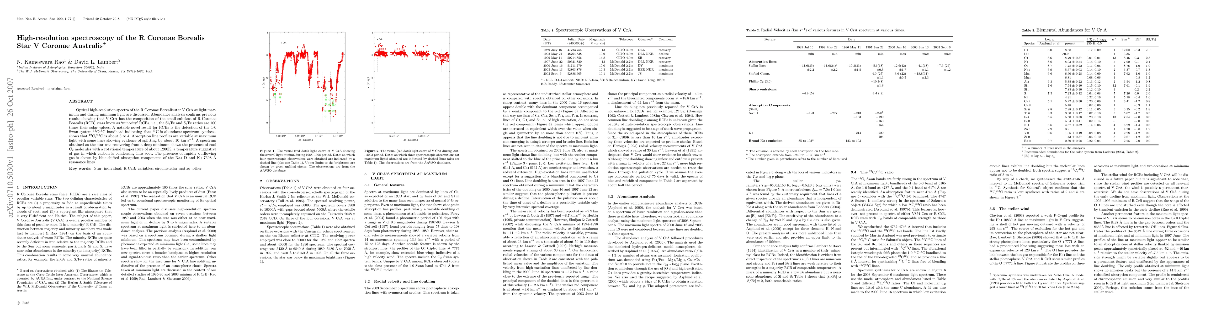 Optical high-resolution spectra of the R Coronae Borealis star V CrA at light maximum and during minimum light arediscussed. Abundance analysis confirms previous results showing that V CrA has the composition of the small subclass of R Coronae Borealis (RCB) stars know as `minority' RCBs, i.e., the Si/Fe and S/Fe ratios are 100 times their solar values. A notable novel result for RCBs is the detection of the 1-0 Swan system $^{12}$C$^{13}$C bandhead indicating that $^{13}$C is abundant: spectrum synthesis shows that $^{12}$C/$^{13}$C is about 3 to 4. Absorption line profiles are variable at maximum light with some lines showing evidence of splitting by about 10 km s$^{-1}$. A spectrum obtained as the star was recovering from a deep minimum shows the presence of cool C$_2$ molecules with a rotational temperature of about 1200K, a temperature suggestive of gas in which carbon is condensing into soot. The presence of rapidly outflowing gas is shown by blue-shifted absorption components of the Na {\sc i} D and K {\sc i} 7698 \AA resonance lines.