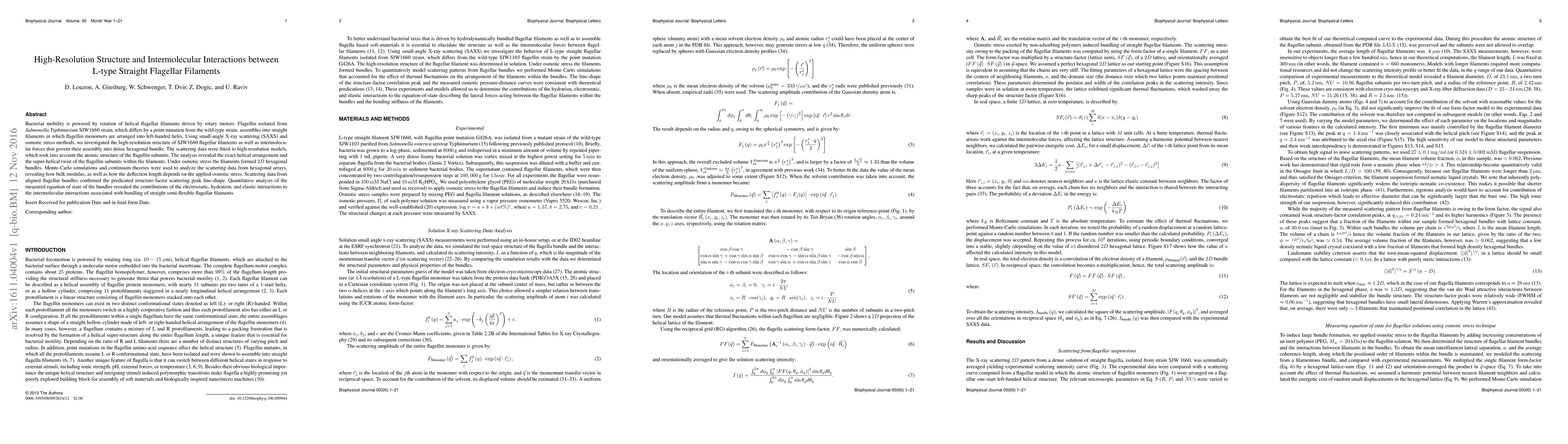 Bacterial mobility is powered by rotation of helical flagellar filaments driven by rotary motors. Flagellin isolated from {\it Salmonella Typhimurium} SJW1660 strain, which differs by a point mutation from the wild-type strain, assembles into straight filaments in which flagellin monomers are arranged into left-handed helix. Using small-angle X-ray scattering (SAXS) and osmotic stress methods, we investigated the high-resolution structure of SJW1660 flagellar filaments as well as intermolecular forces that govern their assembly into dense hexagonal bundle. The scattering data were fitted to high-resolution models, which took into account the atomic structure of the flagellin subunits. The analysis revealed the exact helical arrangement and the super-helical twist of the flagellin subunits within the filaments. Under osmotic stress the filaments formed $2D$ hexagonal bundles. Monte-Carlo simulations and continuum theories were used to analyze the scattering data from hexagonal arrays, revealing how bulk modulus, as well as how the deflection length depends on the applied osmotic stress. Scattering data from aligned flagellar bundles confirmed the predicated structure-factor scattering peak line-shape. Quantitative analysis of the measured equation of state of the bundles revealed the contributions of the electrostatic, hydration, and elastic interactions to the intermolecular interactions associated with bundling of straight semi-flexible flagellar filaments.}%1 {Insert Received for publication Date and in final form Date.