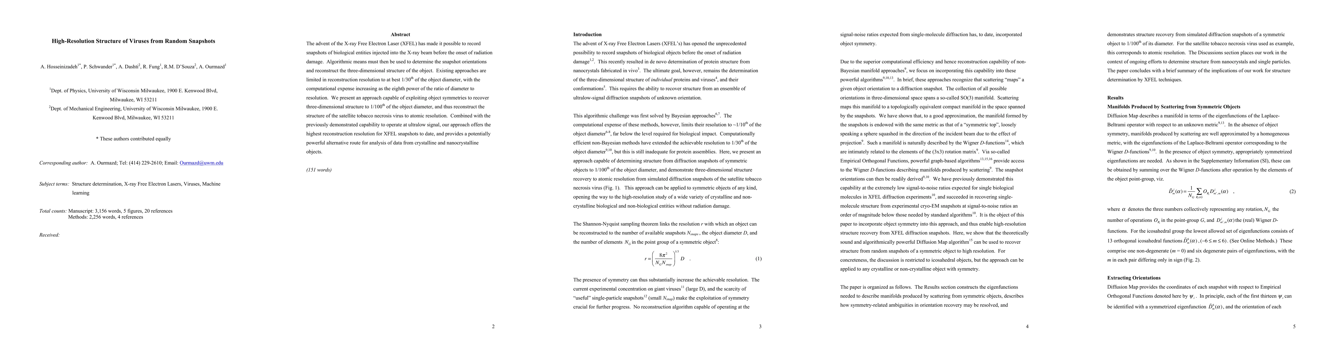 This paper introduces a novel algorithmic method to reconstruct high-resolution three-dimensional structures of viruses from X-ray Free Electron Laser snapshots, achieving atomic resolution by leveraging object symmetries. The approach significantly improves upon existing techniques, offering a powerful new tool for analyzing crystalline and nanocrystalline objects.