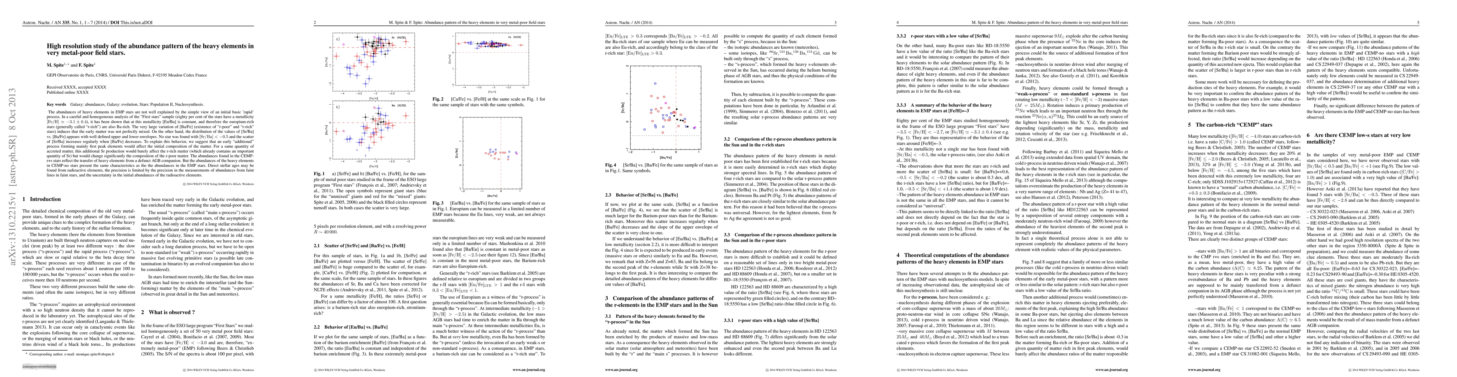 The abundances of heavy elements in EMP stars are not well explained by the simple view of an initial basic "rapid" process. In a careful and homogeneous analysis of the "First stars" sample (eighty per cent of the stars have a metallicity [Fe/H]=-3.1$\pm$0.4), it has been shown that at this metallicity [Eu/Ba] is constant, and therefore the Eu-rich stars (generally called "r-rich") are also Ba-rich. The very large variation of [Ba/Fe] (existence of "r-poor" and "r-rich" stars) induces that the early matter was not perfectly mixed. On the other hand, the distribution of the values of [Sr/Ba] vs. [Ba/Fe] appears with well defined upper and lower envelopes. No star was found with [Sr/Ba]<-0.5 and the scatter of [Sr/Ba] increases regularly when [Ba/Fe] decreases. To explain this behavior, we suggest that an early "additional" process forming mainly first peak elements would affect the initial composition of the matter. For a same quantity of accreted matter, this additional Sr production would barely affect the r-rich matter (which already contains an important quantity of Sr) but would change significantly the composition of the r-poor matter. The abundances found in the CEMP-rs stars reflect the transfer of heavy elements from a defunct AGB companion. But the abundances of the heavy elements in CEMP-no stars present the same characteristics as the the abundances in the EMP stars.