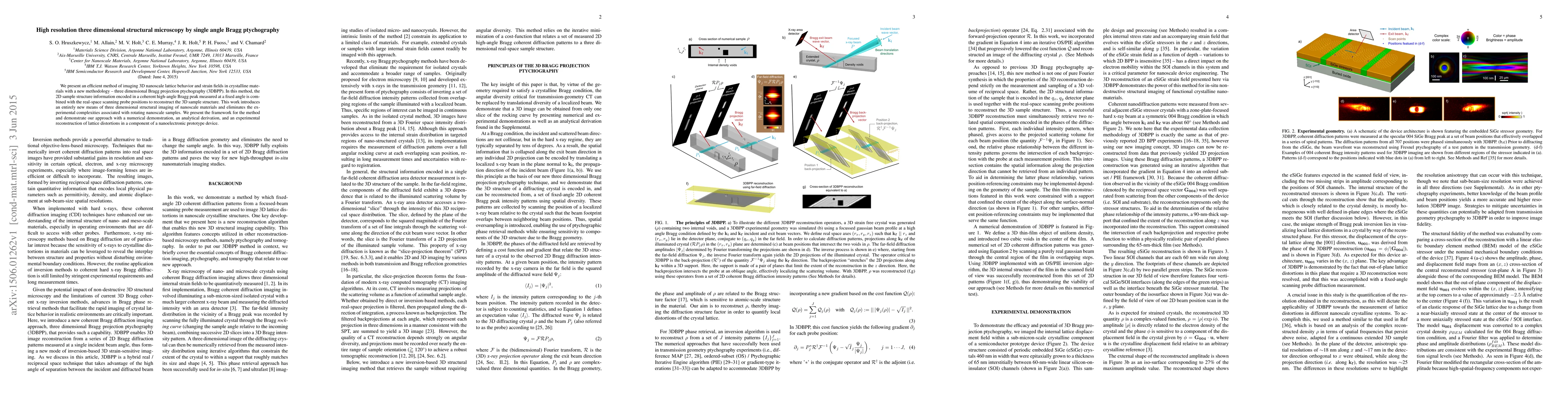 This paper introduces three-dimensional Bragg projection ptychography (3DBPP) for imaging nanoscale lattice behavior and strain fields in crystalline materials without sample rotation. The method combines 2D sample structure information from a coherent high-angle Bragg peak with scanning probe positions to reconstruct 3D structures, demonstrating its potential through numerical, analytical, and experimental validations.