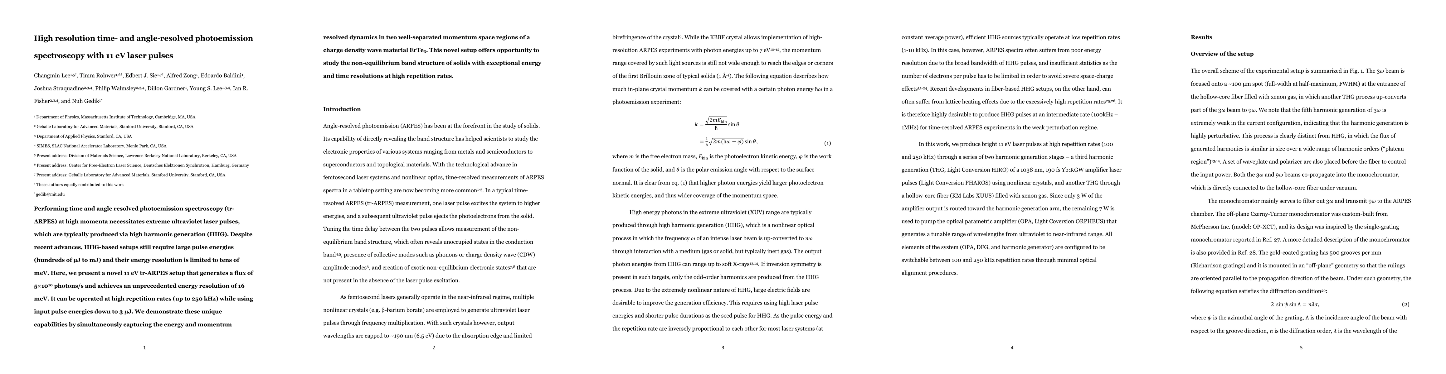 Performing time and angle resolved photoemission spectroscopy (tr-ARPES) at high momenta necessitates extreme ultraviolet laser pulses, which are typically produced via high harmonic generation (HHG). Despite recent advances, HHG-based setups still require large pulse energies (hundreds of $\mu$J to mJ) and their energy resolution is limited to tens of meV. Here, we present a novel 11 eV tr-ARPES setup that generates a flux of $5\times10^{10}$ photons/s and achieves an unprecedented energy resolution of 16 meV. It can be operated at high repetition rates (up to 250 kHz) while using input pulse energies down to 3 $\mu$J. We demonstrate these unique capabilities by simultaneously capturing the energy and momentum resolved dynamics in two well-separated momentum space regions of a charge density wave material ErTe$_3$. This novel setup offers opportunity to study the non-equilibrium band structure of solids with exceptional energy and time resolutions at high repetition rates.