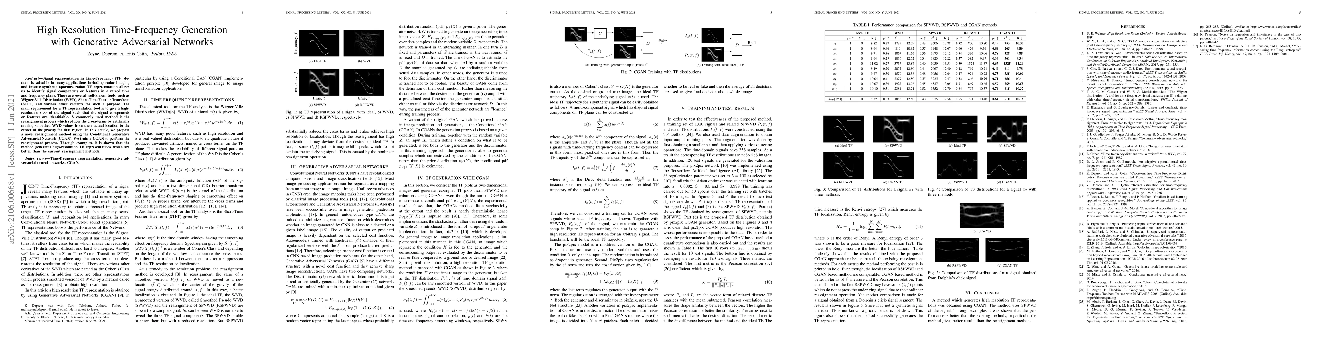 This paper proposes a novel high-resolution time-frequency generation method using Conditional Generative Adversarial Networks (CGAN) for improved signal representation in the TF domain. The CGAN-based reassignment method outperforms existing techniques like the reassignment process for the Wigner-Ville Distribution.