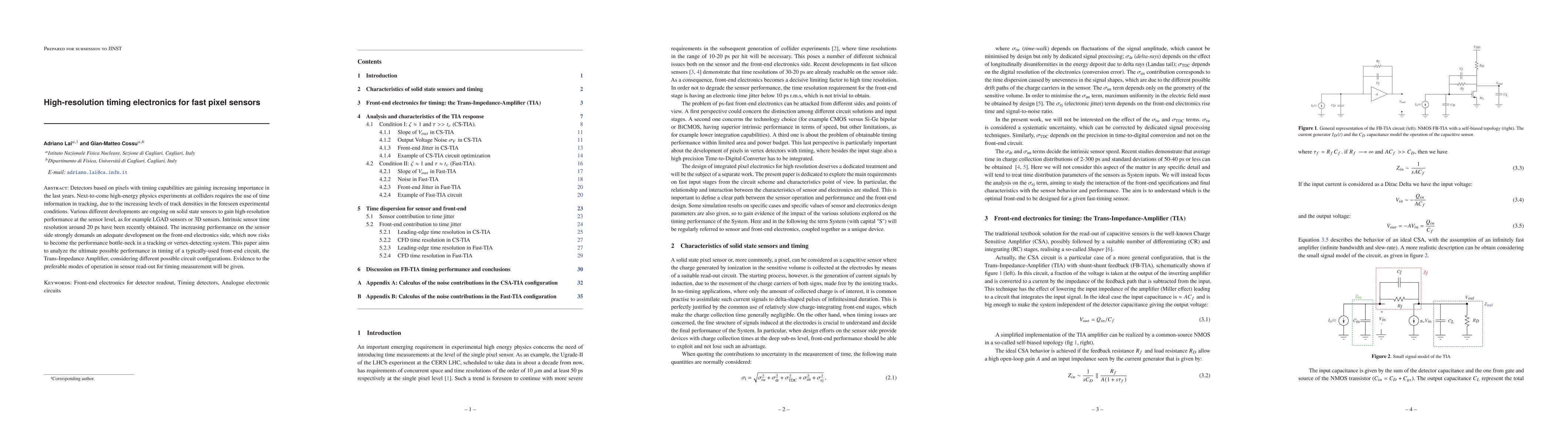 This paper investigates the high-resolution timing capabilities of front-end electronics for fast pixel sensors, focusing on the Trans-Impedance Amplifier. It analyzes various circuit configurations to determine the optimal modes for achieving the best timing performance in high-energy physics experiments.