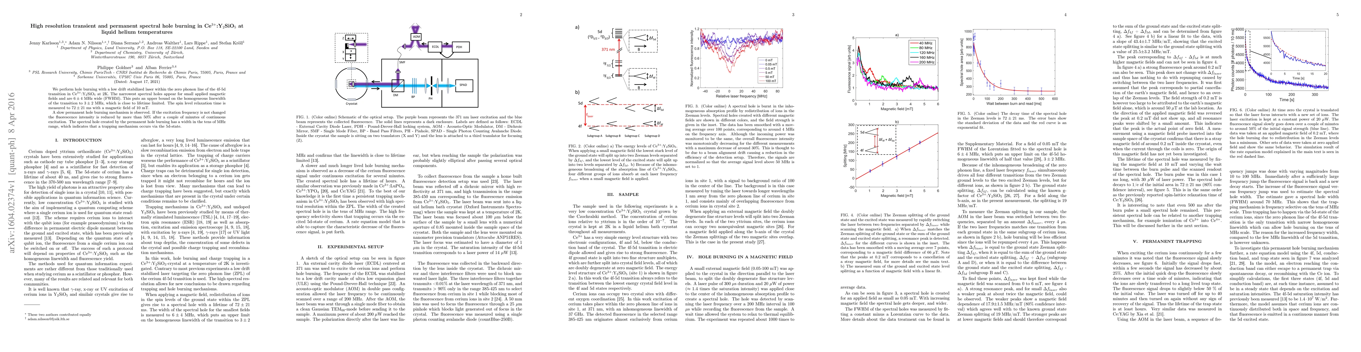 The research employs hole burning with a stabilized laser within the zero phonon line of the 4f-5d transition in Ce3+:Y2SiO5 at liquid helium temperatures (2K).