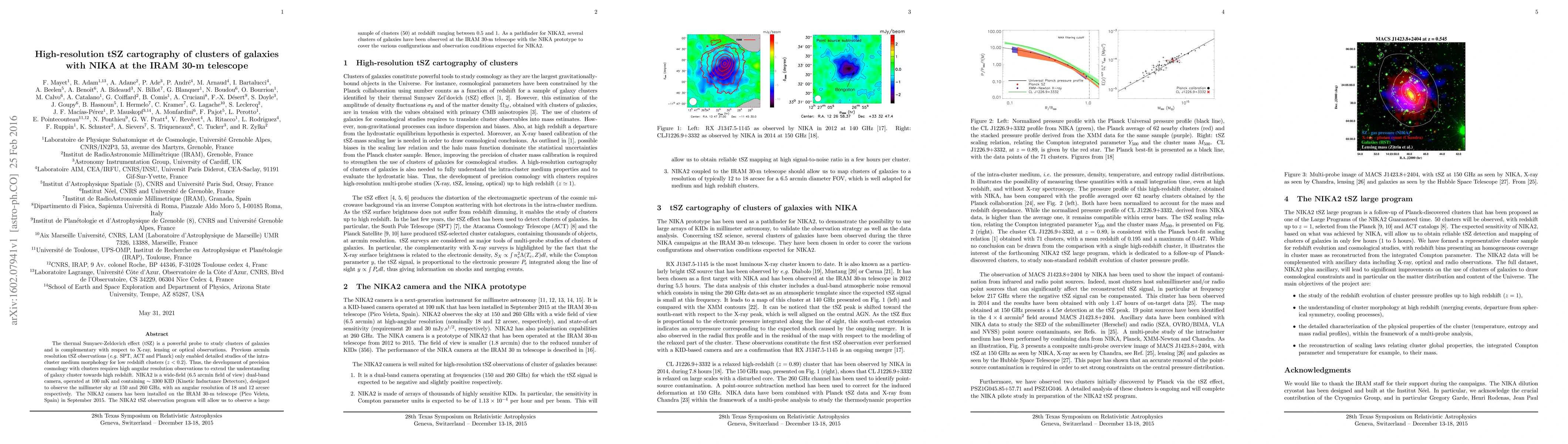 The thermal Sunyaev-Zeldovich effect (tSZ) is a powerful probe to study clusters of galaxies and is complementary with respect to X-ray, lensing or optical observations. Previous arcmin resolution tSZ observations ({\it e.g.} SPT, ACT and Planck) only enabled detailed studies of the intra-cluster medium morphology for low redshift clusters ($z < 0.2$). Thus, the development of precision cosmology with clusters requires high angular resolution observations to extend the understanding of galaxy cluster towards high redshift. NIKA2 is a wide-field (6.5 arcmin field of view) dual-band camera, operated at $100 \ {\rm mK}$ and containing $\sim 3300$ KID (Kinetic Inductance Detectors), designed to observe the millimeter sky at 150 and 260 GHz, with an angular resolution of 18 and 12 arcsec respectively. The NIKA2 camera has been installed on the IRAM 30-m telescope (Pico Veleta, Spain) in September 2015. The NIKA2 tSZ observation program will allow us to observe a large sample of clusters (50) at redshift ranging between 0.5 and 1. As a pathfinder for NIKA2, several clusters of galaxies have been observed at the IRAM 30-m telescope with the NIKA prototype to cover the various configurations and observation conditions expected for NIKA2.