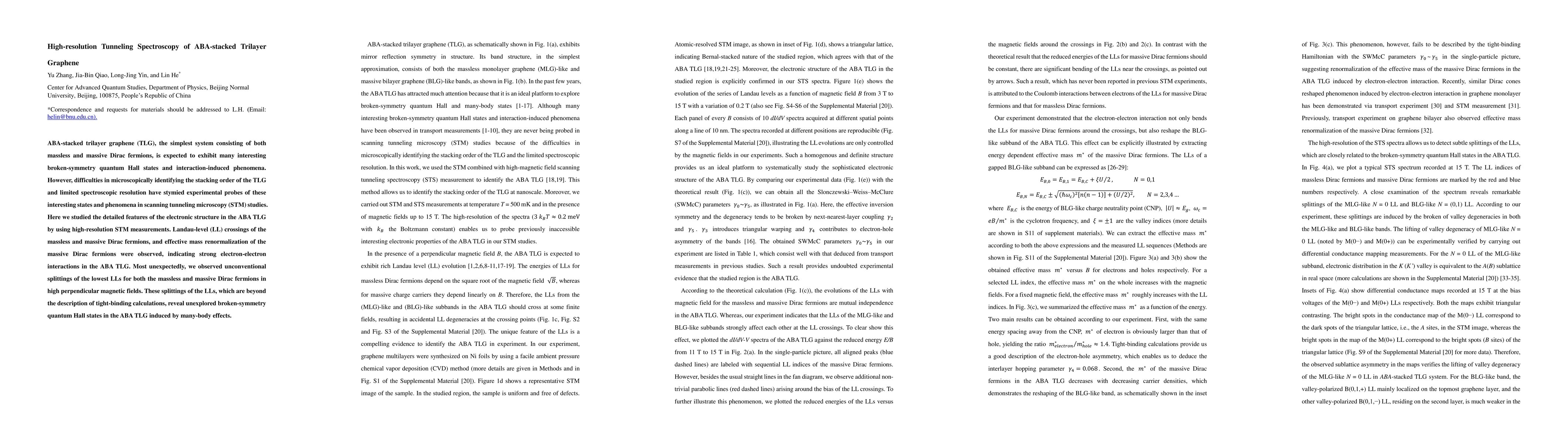 ABA-stacked trilayer graphene (TLG), the simplest system consisting of both massless and massive Dirac fermions, is expected to exhibit many interesting broken-symmetry quantum Hall states and interaction-induced phenomena. However, difficulties in microscopically identifying the stacking order of the TLG and limited spectroscopic resolution have stymied experimental probes of these interesting states and phenomena in scanning tunneling microscopy (STM) studies. Here we studied the detailed features of the electronic structure in the ABA TLG by using high-resolution STM measurements. Landau-level (LL) crossings of the massless and massive Dirac fermions, and effective mass renormalization of the massive Dirac fermions were observed, indicating strong electron-electron interactions in the ABA TLG. Most unexpectedly, we observed unconventional splittings of the lowest LLs for both the massless and massive Dirac fermions in high perpendicular magnetic fields. These splittings of the LLs, which are beyond the description of tight-binding calculations, reveal unexplored broken-symmetry quantum Hall states in the ABA TLG induced by many-body effects.