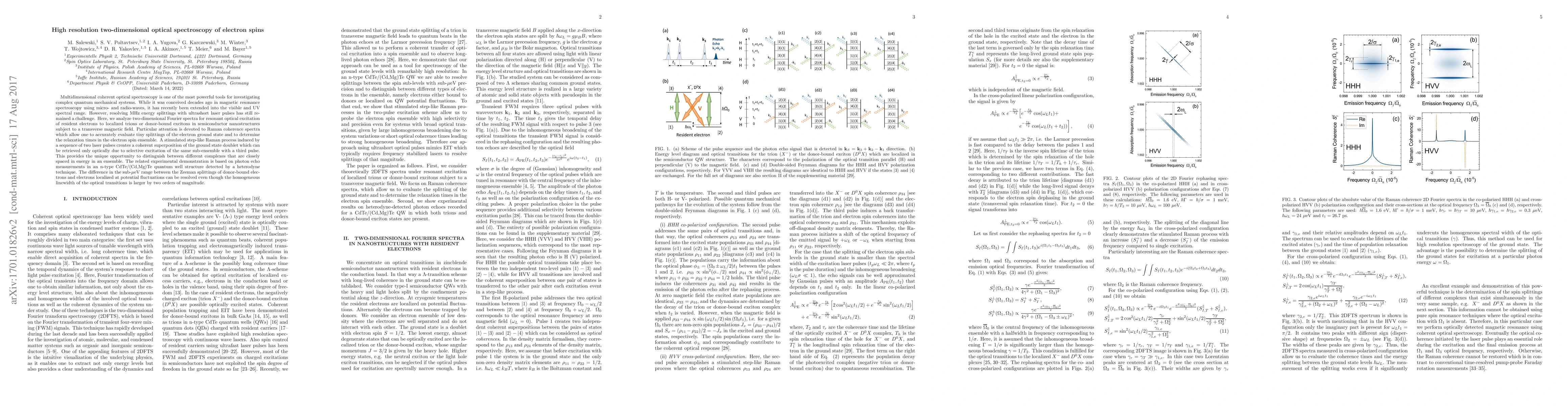 Multidimensional coherent optical spectroscopy is one of the most powerful tools for investigating complex quantum mechanical systems. While it was conceived decades ago in magnetic resonance spectroscopy using micro- and radio-waves, it has recently been extended into the visible and UV spectral range. However, resolving MHz energy splittings with ultrashort laser pulses has still remained a challenge. Here, we analyze two-dimensional Fourier spectra for resonant optical excitation of resident electrons to localized trions or donor-bound excitons in semiconductor nanostructures subject to a transverse magnetic field. Particular attention is devoted to Raman coherence spectra which allow one to accurately evaluate tiny splittings of the electron ground state and to determine the relaxation times in the electron spin ensemble. A stimulated step-like Raman process induced by a sequence of two laser pulses creates a coherent superposition of the ground state doublet which can be retrieved only optically due to selective excitation of the same sub-ensemble with a third pulse. This provides the unique opportunity to distinguish between different complexes that are closely spaced in energy in an ensemble. The related experimental demonstration is based on photon echo measurements in an n-type CdTe/(Cd,Mg)Te quantum well structure detected by a heterodyne technique. The difference in the sub-$\mu$eV range between the Zeeman splittings of donor-bound electrons and electrons localized at potential fluctuations can be resolved even though the homogeneous linewidth of the optical transitions is larger by two orders of magnitude.