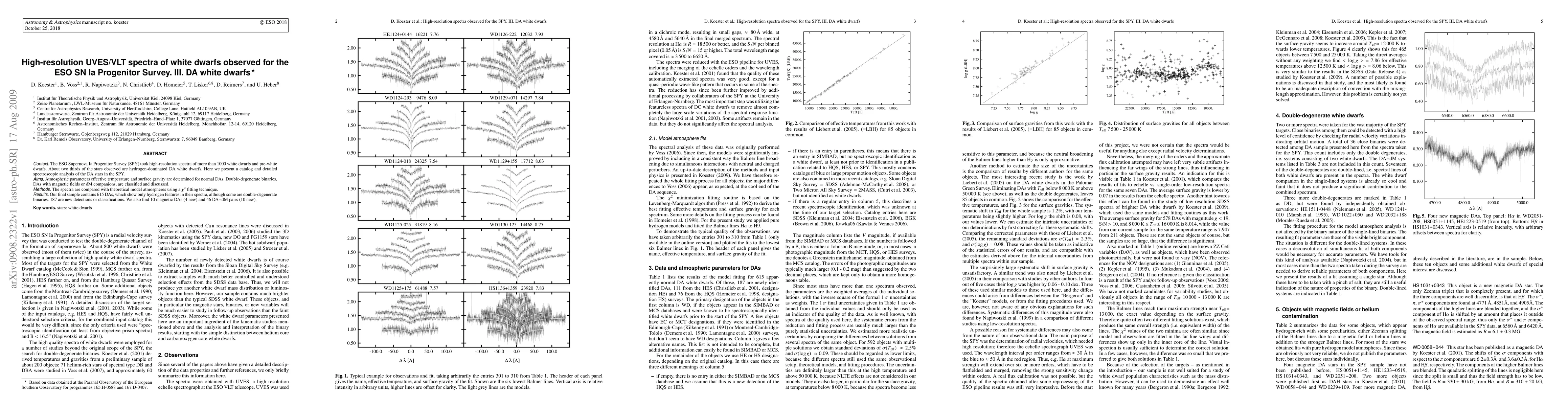 The ESO Supernova Ia Progenitor Survey (SPY) took high-resolution spectra of more than 1000 white dwarfs and pre-white dwarfs. About two thirds of the stars observed are hydrogen-dominated DA white dwarfs. Here we present a catalog and detailed spectroscopic analysis of the DA stars in the SPY. Atmospheric parameters effective temperature and surface gravity are determined for normal DAs. Double-degenerate binaries, DAs with magnetic fields or dM companions, are classified and discussed. The spectra are compared with theoretical model atmospheres using a chi^2 fitting technique. Our final sample contains 615 DAs, which show only hydrogen features in their spectra, although some are double-degenerate binaries. 187 are new detections or classifications. We also find 10 magnetic DAs (4 new) and 46 DA+dM pairs (10 new).