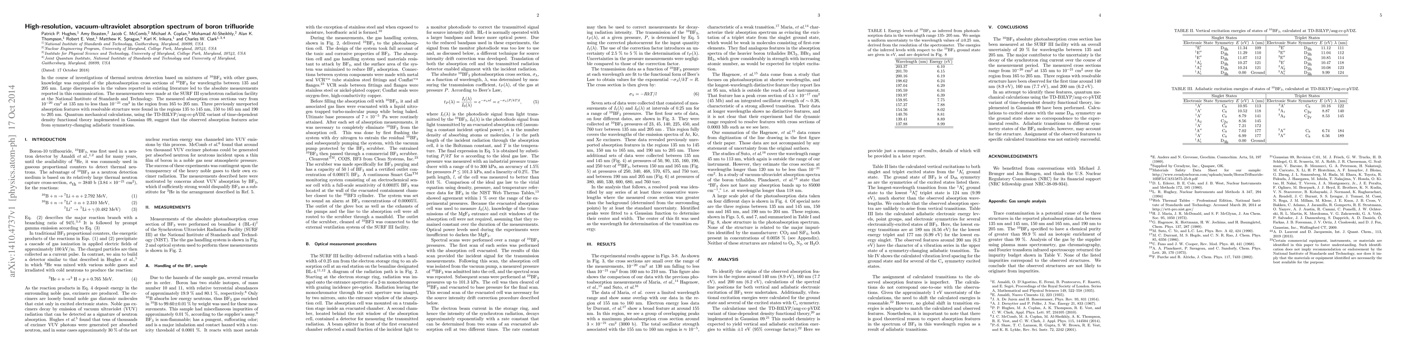 In the course of investigations of thermal neutron detection based on mixtures of $^{10}$BF$_3$ with other gases, knowledge was required of the photoabsorption cross sections of $^{10}$BF$_3$ for wavelengths between 135 and 205 nm. Large discrepancies in the values reported in existing literature led to the absolute measurements reported in this communication. The measurements were made at the SURF III synchrotron radiation facility at the National Institute of Standards and Technology. The measured absorption cross sections vary from 10$^{-20}$ cm$^2$ at 135 nm to less than 10$^{-21}$ cm$^2$ in the region from 165 to 205 nm. Three previously unreported absorption features with resolvable structure were found in the regions 135 to 145 nm, 150 to 165 nm and 190 to 205 nm. Quantum mechanical calculations, using the TD-B3LYP/aug-cc-pVDZ variant of time-dependent density functional theory implemented in Gaussian 09, suggest that the observed absorption features arise from symmetry-changing adiabatic transitions.