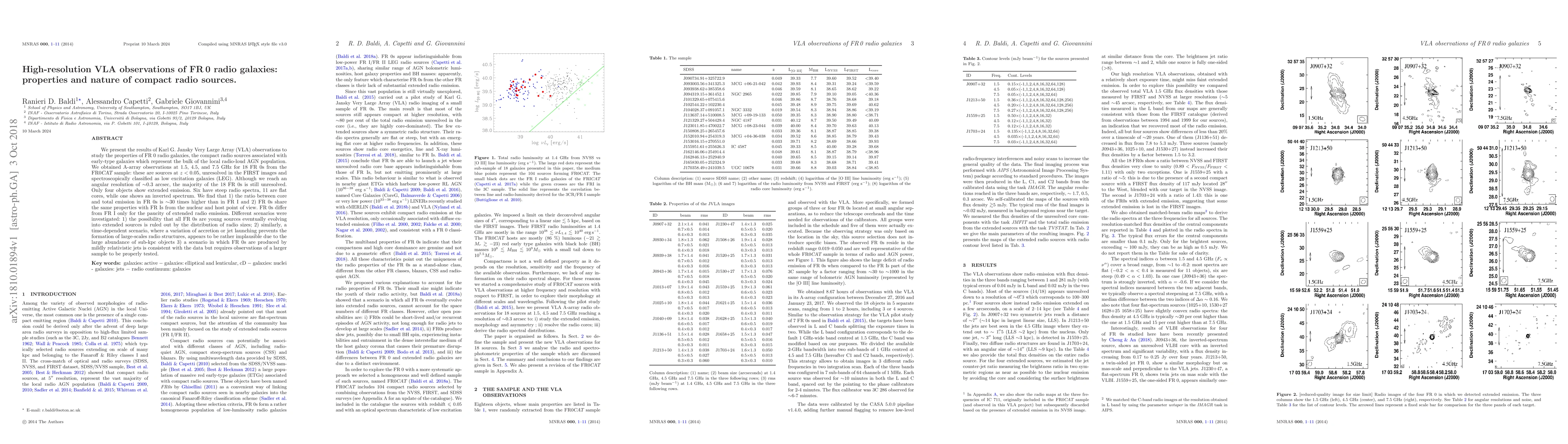We present the results of Karl G. Jansky Very Large Array (VLA) observations to study the properties of FR0 radio galaxies, the compact radio sources associated with early-type galaxies which represent the bulk of the local radio-loud AGN population. We obtained A-array observations at 1.5, 4.5, and 7.5 GHz for 18 FR0s from the FR0CAT sample: these are sources at $z<0.05$, unresolved in the FIRST images and spectroscopically classified as low excitation galaxies (LEG). Although we reach an angular resolution of $\sim$0.3 arcsec, the majority of the 18 FR0s is still unresolved. Only four objects show extended emission. Six have steep radio spectra, 11 are flat cores, while one shows an inverted spectrum. We find that 1) the ratio between core and total emission in FR0s is $\sim$30 times higher than in FRI and 2) FR0s share the same properties with FRIs from the nuclear and host point of view. FR0s differ from FRIs only for the paucity of extended radio emission. Different scenarios were investigated: 1) the possibility that all FR0s are young sources eventually evolving into extended sources is ruled out by the distribution of radio sizes; 2) similarly, a time-dependent scenario, where a variation of accretion or jet launching prevents the formation of large-scales radio structures, appears to be rather implausible due to the large abundance of sub-kpc objects 3) a scenario in which FR0s are produced by mildly relativistic jets is consistent with the data but requires observations of a larger sample to be properly tested.