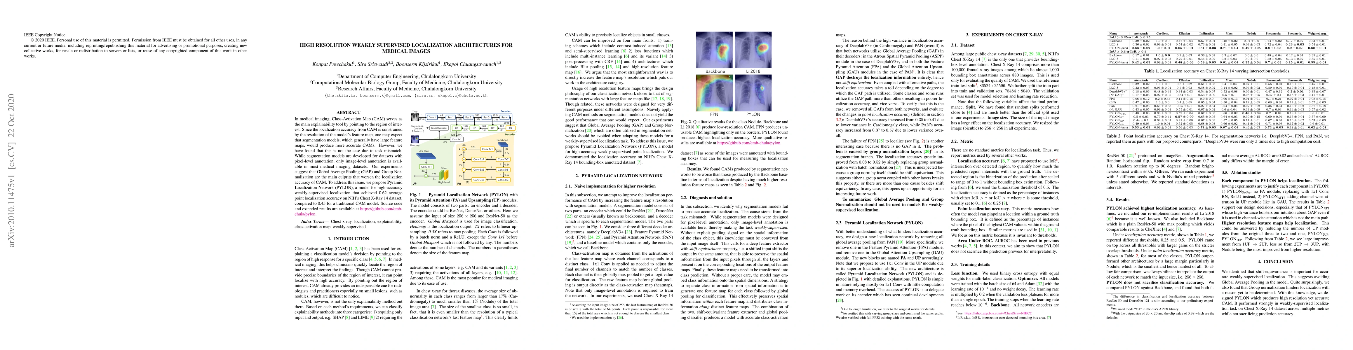 In medical imaging, Class-Activation Map (CAM) serves as the main explainability tool by pointing to the region of interest. Since the localization accuracy from CAM is constrained by the resolution of the model's feature map, one may expect that segmentation models, which generally have large feature maps, would produce more accurate CAMs. However, we have found that this is not the case due to task mismatch. While segmentation models are developed for datasets with pixel-level annotation, only image-level annotation is available in most medical imaging datasets. Our experiments suggest that Global Average Pooling (GAP) and Group Normalization are the main culprits that worsen the localization accuracy of CAM. To address this issue, we propose Pyramid Localization Network (PYLON), a model for high-accuracy weakly-supervised localization that achieved 0.62 average point localization accuracy on NIH's Chest X-Ray 14 dataset, compared to 0.45 for a traditional CAM model. Source code and extended results are available at https://github.com/cmb-chula/pylon.