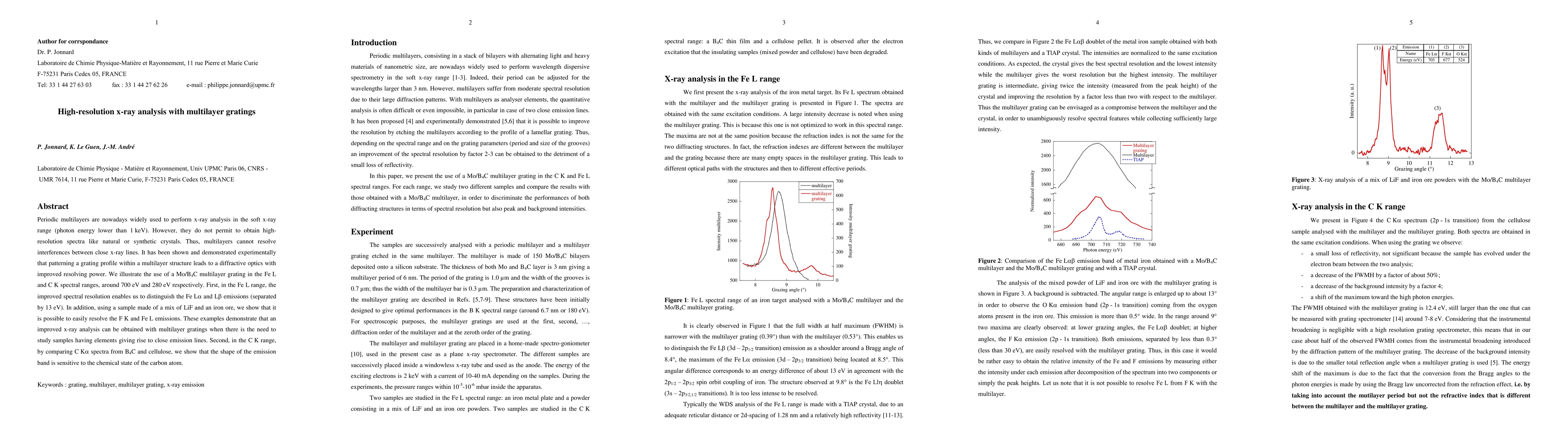 Periodic multilayers are nowadays widely used to perform x-ray analysis in the soft x-ray range (photon energy lower than 1 keV). However, they do not permit to obtain high-resolution spectra like natural or synthetic crystals. Thus, multilayers cannot resolve interferences between close x-ray lines. It has been shown and demonstrated experimentally that patterning a grating profile within a multilayer structure leads to a diffractive optics with improved resolving power. We illustrate the use of a Mo/B4C multilayer grating in the Fe L and C K spectral ranges, around 700 eV and 280 eV respectively. First, in the Fe L range, the improved spectral resolution enables us to distinguish the Fe L\alpha and L\beta emissions (separated by 13 eV). In addition, using a sample made of a mix of LiF and an iron ore, we show that it is possible to easily resolve the F K and Fe L emissions. These examples demonstrate that an improved x-ray analysis can be obtained with multilayer gratings when there is the need to study samples having elements giving rise to close emission lines. Second, in the C K range, by comparing C K\alpha spectra from B4C and cellulose, we show that the shape of the emission band is sensitive to the chemical state of the carbon atom.