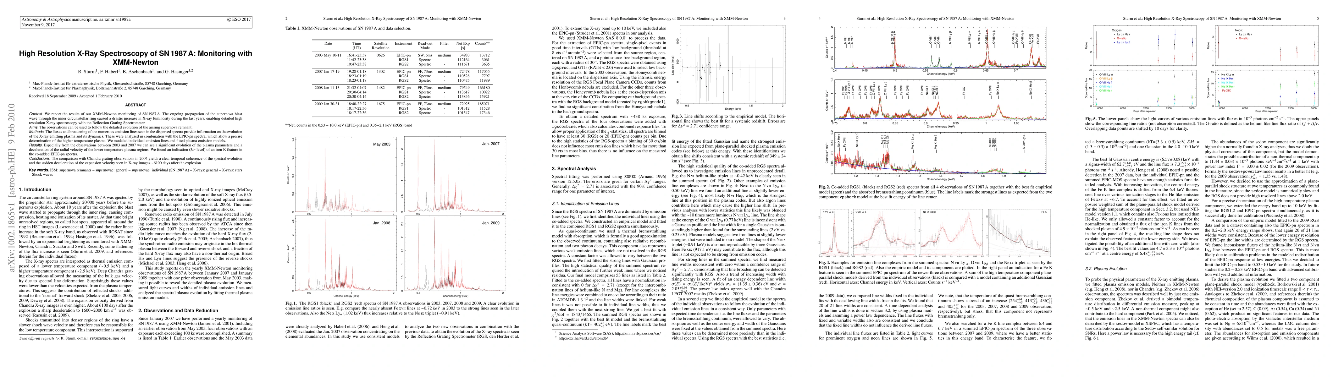 This study uses XMM-Newton to monitor the evolution of SN 1987A, revealing significant changes in X-ray luminosity and plasma dynamics due to the supernova blast wave's interaction with the inner circumstellar ring. The high-resolution spectroscopy indicates a deceleration of lower temperature plasma regions and a potential iron K feature, correlating with Chandra observations.