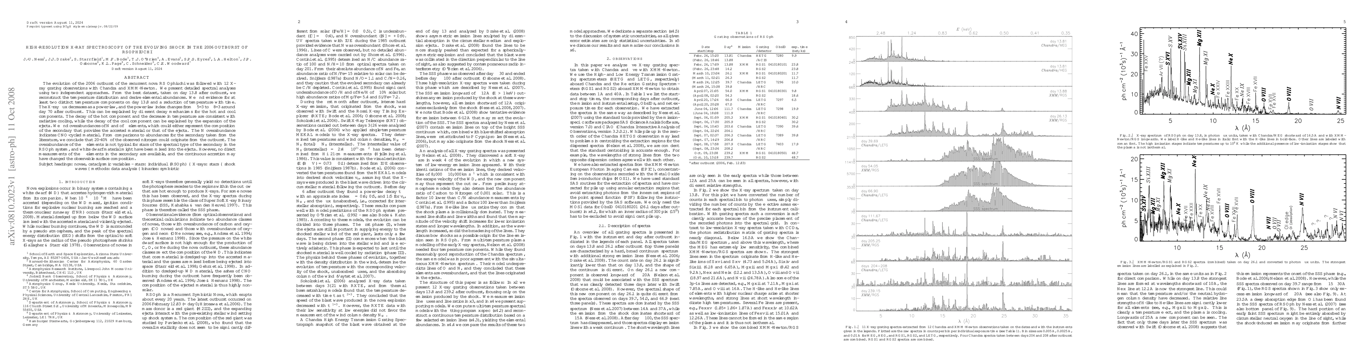 This study uses high-resolution X-ray spectroscopy to analyze the evolving shock in the 2006 outburst of RS Ophiuchi, revealing two distinct temperature components and a reduction in temperature over time. The X-ray flux decay suggests different mechanisms for the hot and cool components, with the observed nitrogen overabundance indicating CNO-cycled material from the outburst.