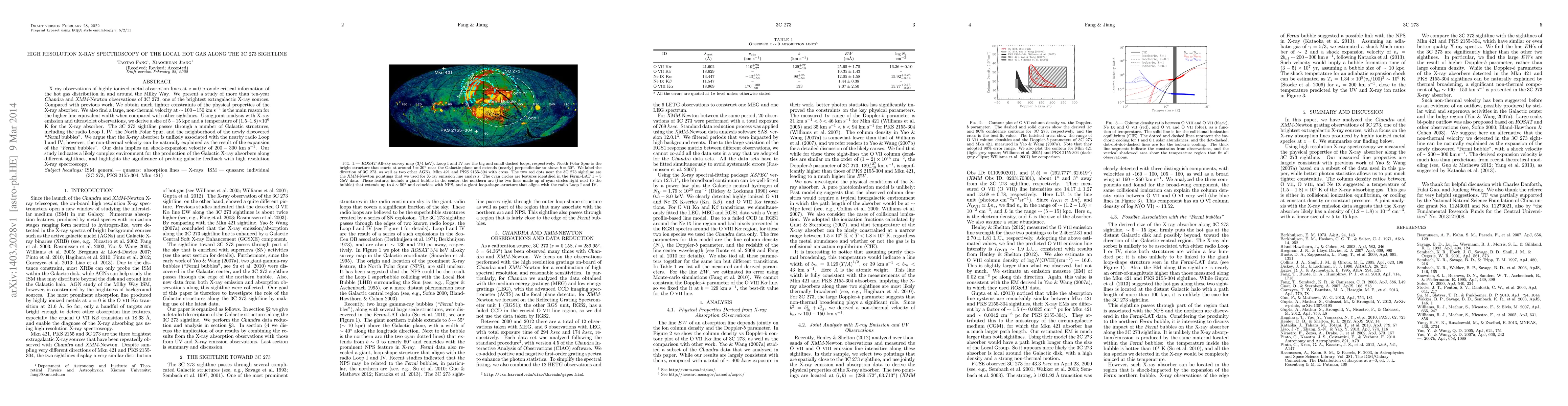 This paper presents high-resolution X-ray spectroscopy of the local hot gas along the 3C 273 sightline, revealing tighter constraints on the physical properties of the X-ray absorber. The study finds a large non-thermal velocity likely due to the expansion of the "Fermi bubbles," suggesting a complex environment for Galactic X-ray absorbers.