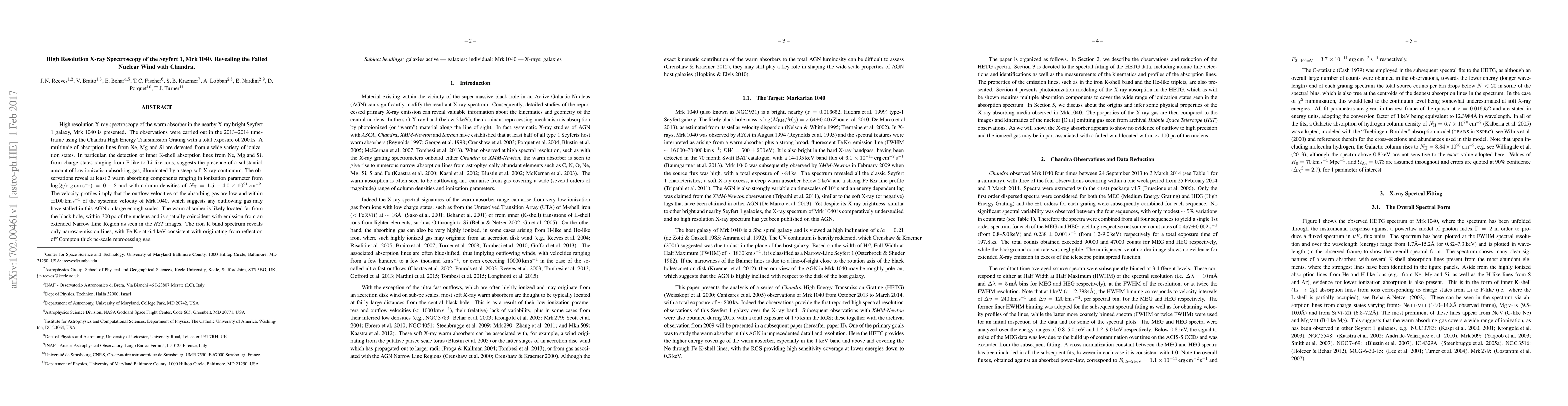 High-resolution X-ray spectroscopy of Seyfert 1 galaxy Mrk 1040 with Chandra revealed multiple warm absorber components with low outflow velocities, suggesting stalled gas within 300 pc of the nucleus. The iron K band spectrum showed narrow emission lines, indicating Compton thick pc-scale reprocessing gas.