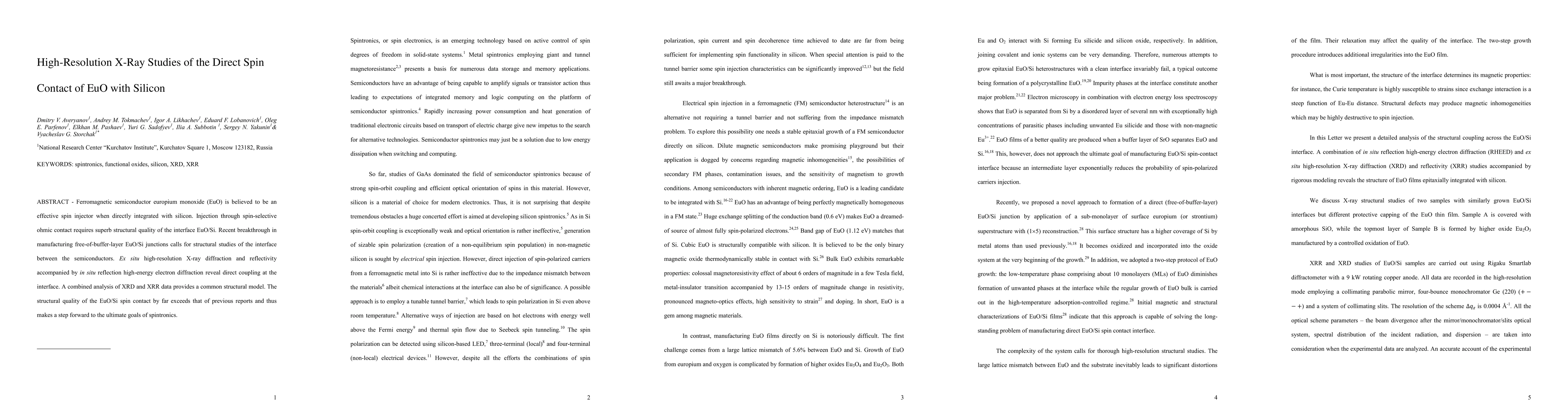 This study employs high-resolution X-ray techniques to investigate the structural quality of direct spin contact between europium monoxide (EuO) and silicon, revealing superior interface coupling and advancing the potential for spintronic applications. The structural model derived from the analysis supports the feasibility of effective spin injection in EuO/Si junctions.