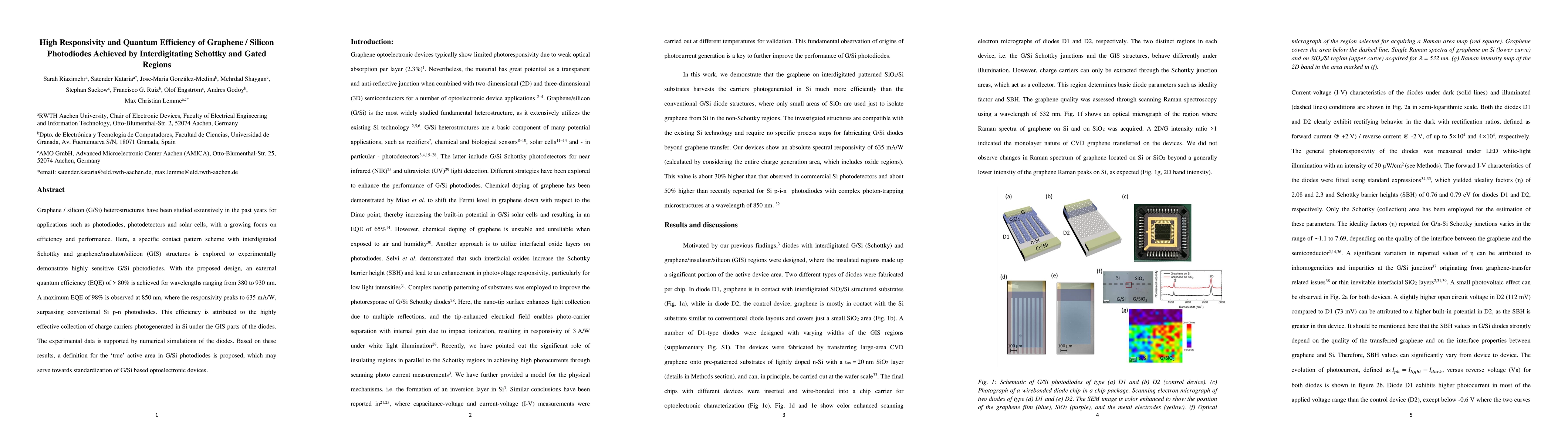 This paper demonstrates highly efficient graphene/silicon photodiodes using interdigitated Schottky and gated regions, achieving an external quantum efficiency of over 80% across a broad spectrum, with a peak of 98% at 850 nm and a responsivity of 635 mA/W, significantly outperforming conventional silicon photodiodes. The design's success is attributed to the effective collection of photogenerated charge carriers in silicon.