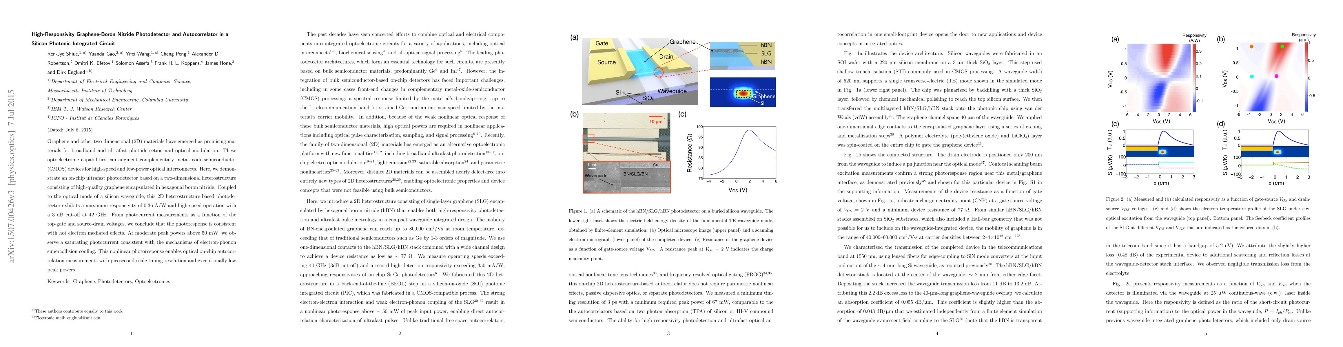 This paper demonstrates a high-responsivity graphene-boron nitride photodetector integrated into a silicon photonic circuit, achieving a maximum responsivity of 0.36 A/W and a 3 dB cut-off frequency of 42 GHz. The photodetector's nonlinear response enables picosecond-scale optical autocorrelation measurements with low peak power requirements.