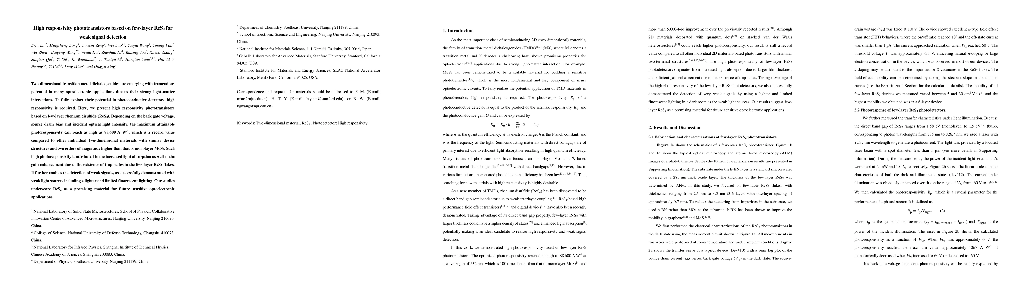This paper presents high responsivity phototransistors based on few-layer rhenium disulfide (ReS2) for weak signal detection, achieving a record photoresponsivity of 88,600 A W-1, significantly higher than monolayer MoS2. The enhanced performance is due to increased light absorption and gain enhancement from trap states in ReS2.