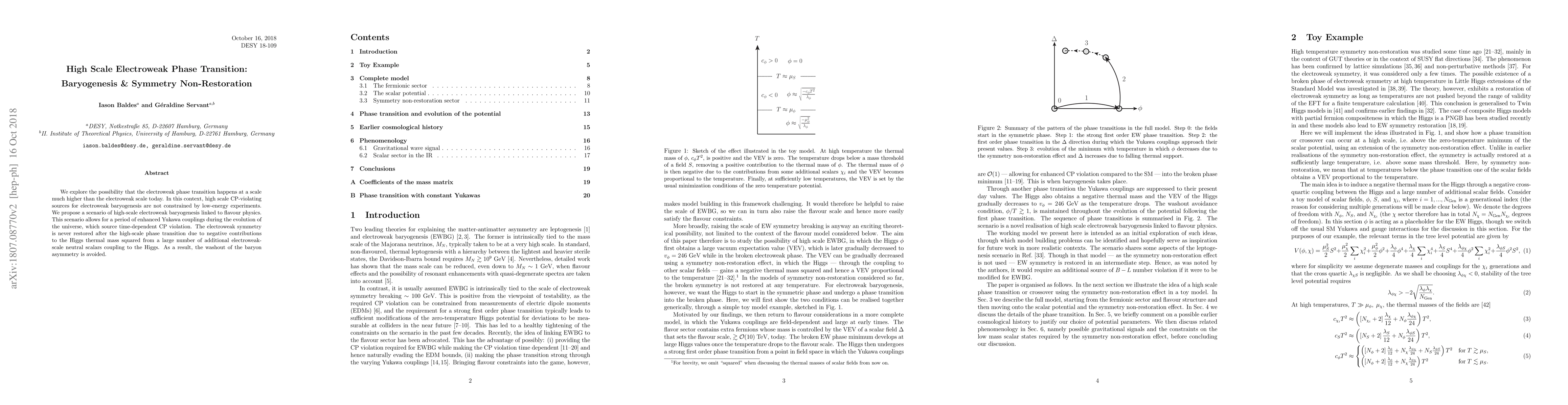 This paper investigates a high-scale electroweak phase transition, proposing a scenario where CP-violating sources for baryogenesis are not constrained by low-energy experiments. It suggests that the electroweak symmetry remains unbroken due to negative contributions from additional scalars, thus avoiding the washout of the baryon asymmetry.