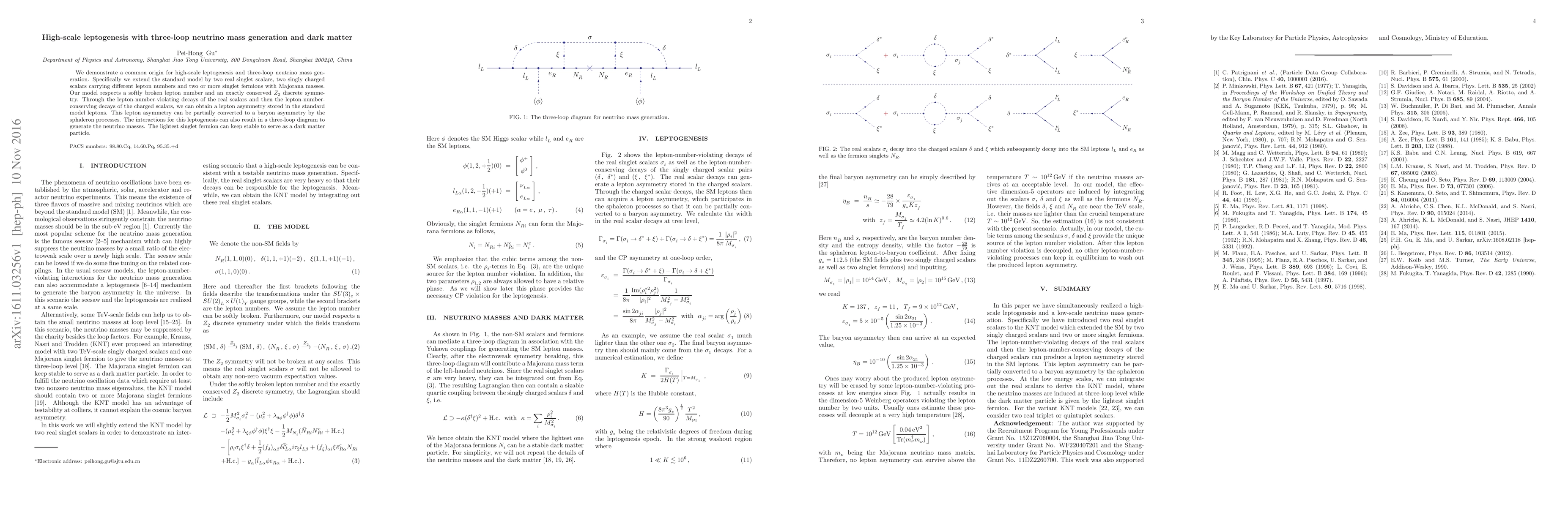 This paper proposes an extension of the Standard Model to unify high-scale leptogenesis and three-loop neutrino mass generation, introducing additional scalars and fermions. The model achieves a lepton asymmetry via scalar decays, which can convert to a baryon asymmetry, while also generating neutrino masses through a three-loop diagram, with the lightest singlet fermion serving as dark matter.