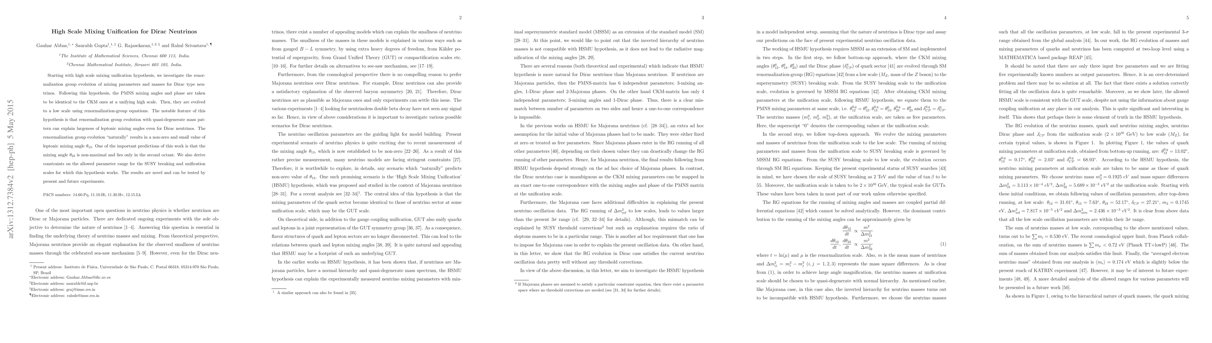 This paper explores high scale mixing unification for Dirac neutrinos, proposing that PMNS mixing angles match CKM angles at a high unifying scale. The study finds that renormalization group evolution with quasi-degenerate masses can naturally yield a non-zero, albeit small, leptonic mixing angle $\theta_{13}$, and predicts a non-maximal $\theta_{23}$ in the second octant.