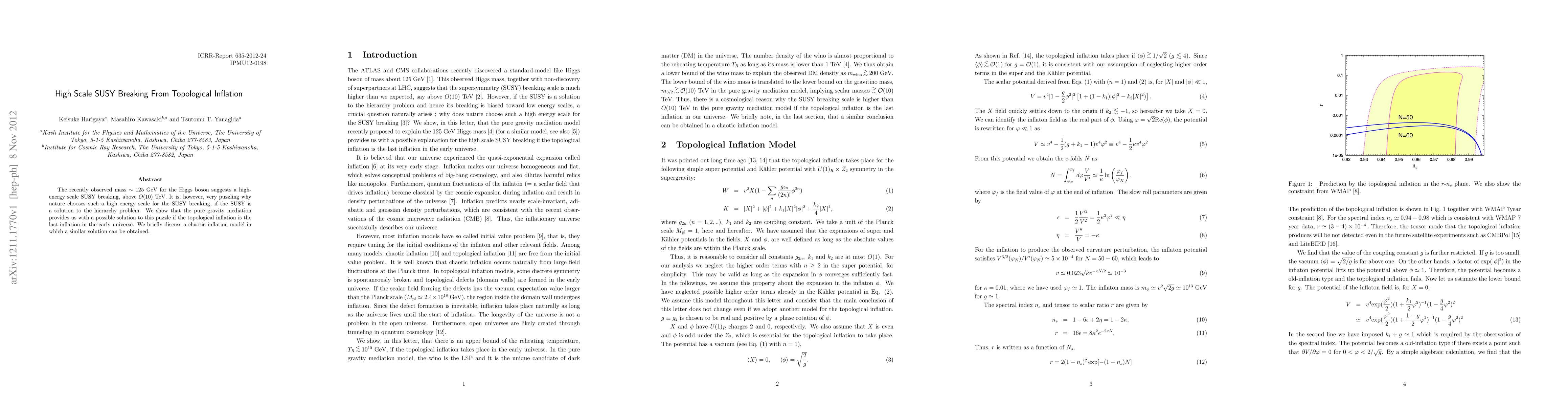 This paper proposes that high-scale SUSY breaking, necessitated by the ~125 GeV Higgs mass, can be explained through pure gravity mediation if topological inflation occurred last in the early universe. It also mentions a chaotic inflation model that could similarly resolve the puzzle of why SUSY breaking occurs at such a high energy scale.