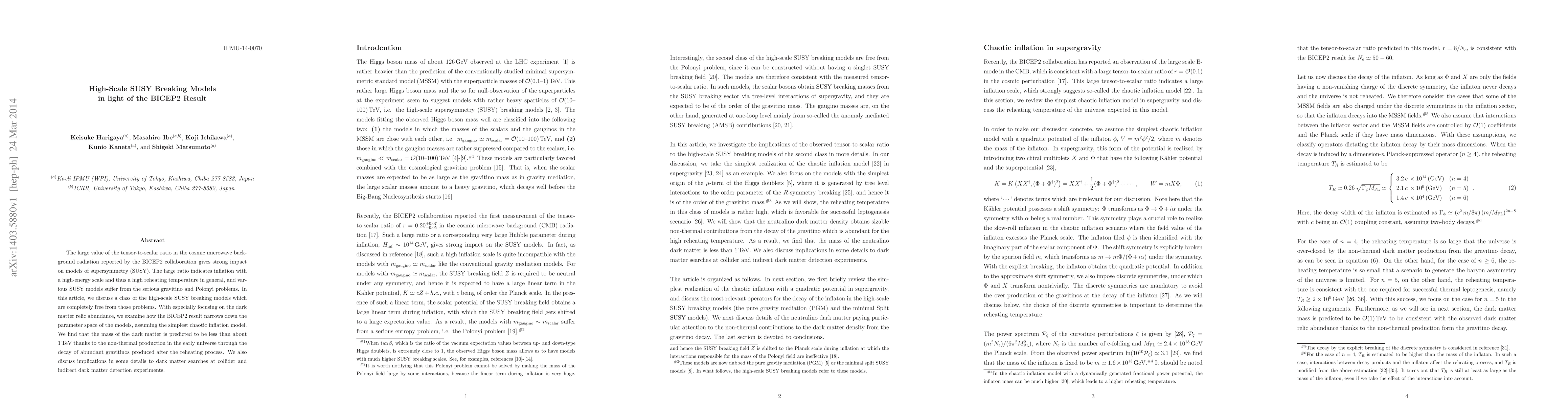 This paper discusses high-scale SUSY breaking models that avoid gravitino and Polonyi problems, especially in light of the BICEP2 result indicating a high tensor-to-scalar ratio. It predicts that the dark matter mass should be less than 1 TeV due to non-thermal production from gravitino decay, and explores implications for collider and indirect dark matter detection experiments.