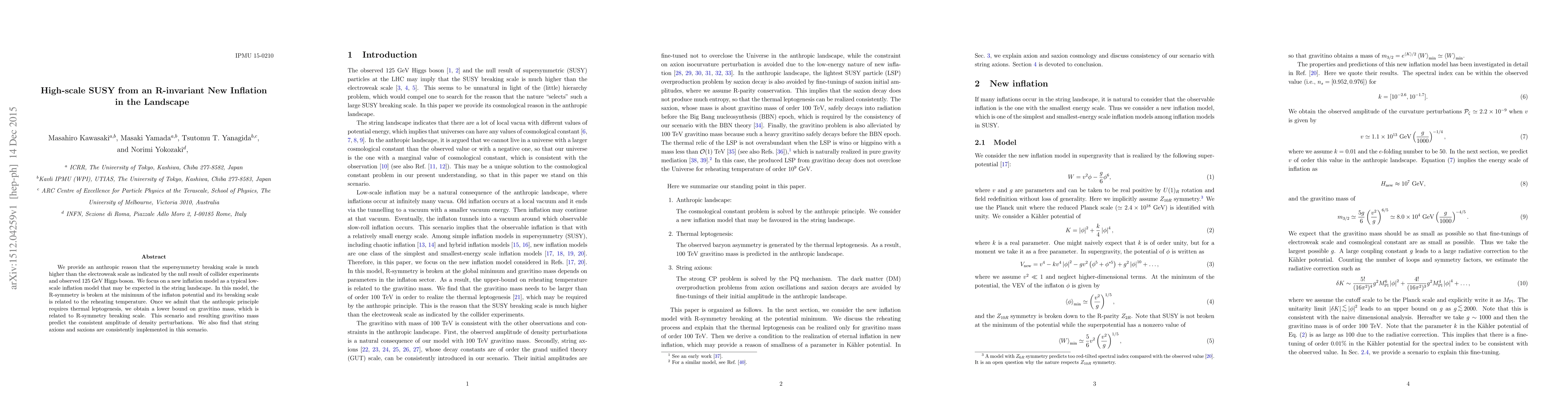 We provide an anthropic reason that the supersymmetry breaking scale is much higher than the electroweak scale as indicated by the null result of collider experiments and observed 125 GeV Higgs boson. We focus on a new inflation model as a typical low-scale inflation model that may be expected in the string landscape. In this model, the R-symmetry is broken at the minimum of the inflaton potential and its breaking scale is related to the reheating temperature. Once we admit that the anthropic principle requires thermal leptogenesis, we obtain a lower bound on gravitino mass, which is related to R-symmetry breaking scale. This scenario and resulting gravitino mass predict the consistent amplitude of density perturbations. We also find that string axions and saxions are consistently implemented in this scenario.