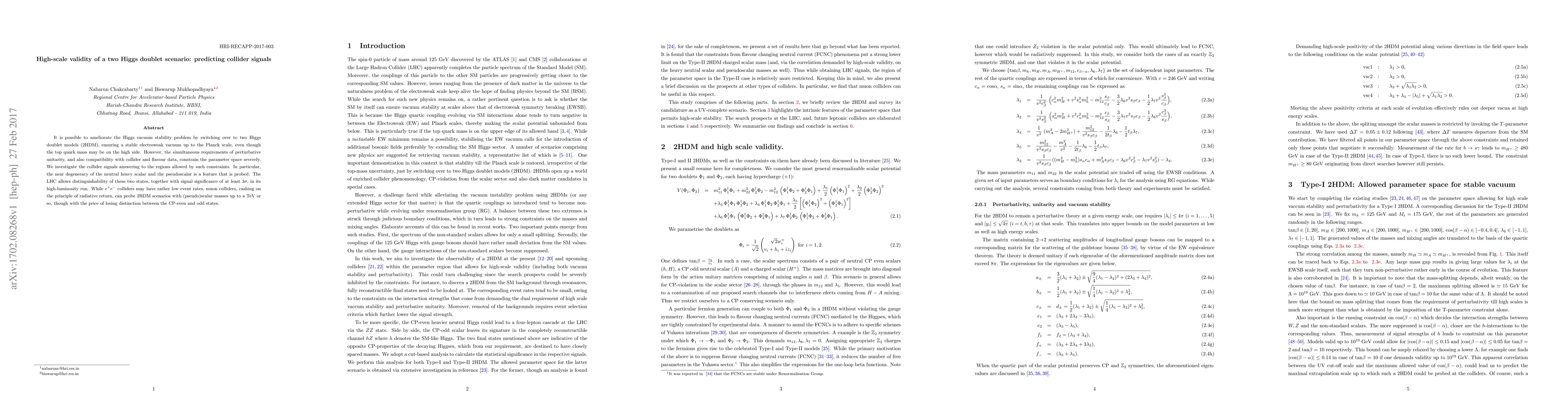 This paper explores the viability of a two Higgs doublet model (2HDM) to stabilize the Higgs vacuum and examines its collider signals under stringent constraints. It highlights that while the LHC can distinguish between neutral heavy scalar and pseudoscalar states in its high-luminosity phase, muon colliders can probe higher mass ranges but lose distinction between CP-even and odd states.