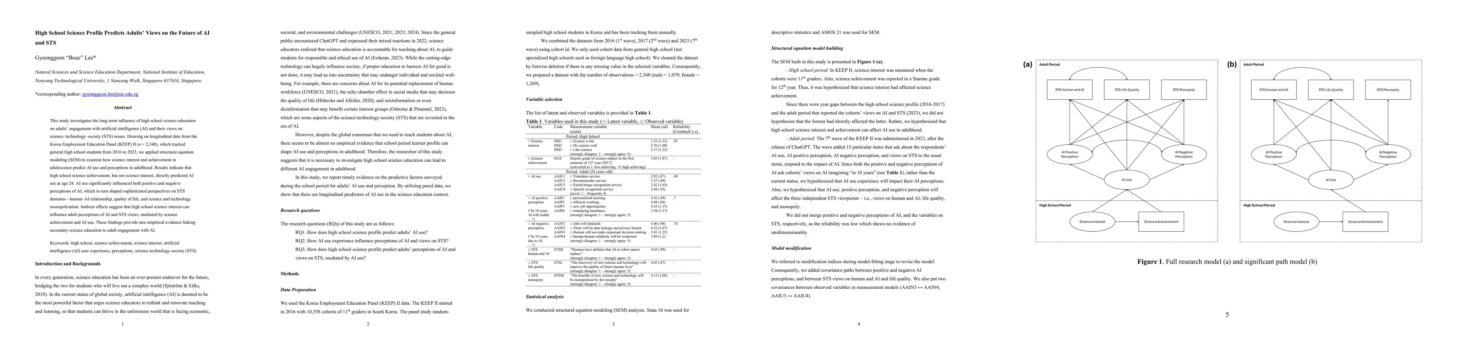 This study investigates the long term influence of high school science education on adults' engagement with artificial intelligence (AI) and their views on science-technology-society (STS) issues. Drawing on longitudinal data from the Korea Employment Education Panel (KEEP) II (n = 2,348), which tracked general high school students from 2016 to 2023, we applied structural equation modeling (SEM) to examine how science interest and achievement in adolescence predict AI use and perceptions in adulthood. Results indicate that high school science achievement, but not science interest, directly predicted AI use at age 24. AI use significantly influenced both positive and negative perceptions of AI, which in turn shaped sophisticated perspectives on STS domains - human-AI relationship, quality of life, and science and technology monopolization. Indirect effects suggest that high school science interest can influence adult perceptions of AI and STS views, mediated by science achievement and AI use. These findings provide rare empirical evidence linking secondary science education to adult engagement with AI.