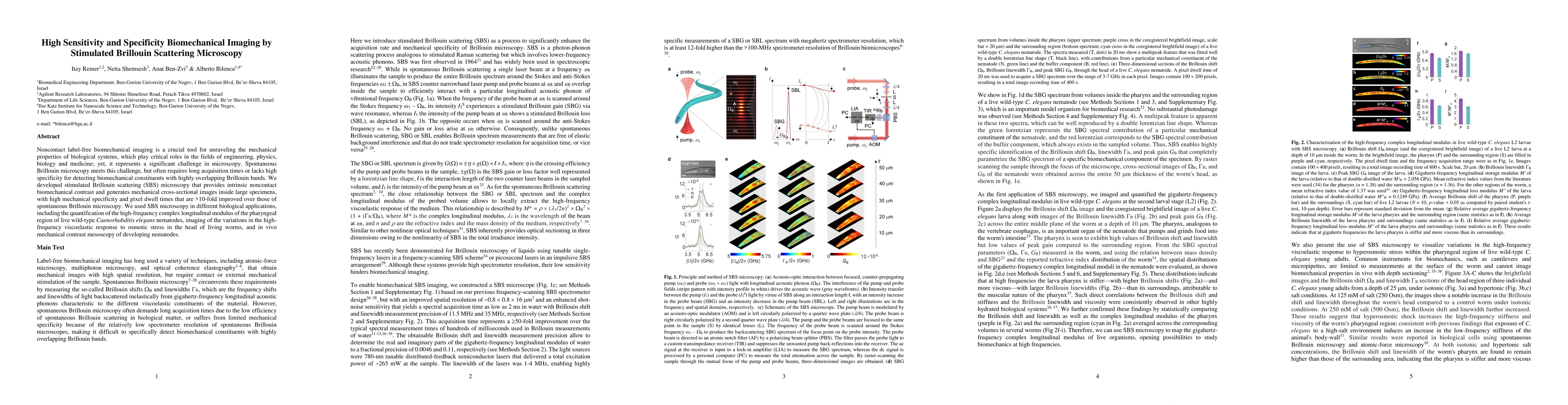 This paper introduces stimulated Brillouin scattering (SBS) microscopy, a noncontact, label-free imaging technique that offers high sensitivity and specificity for biomechanical imaging, significantly improving upon spontaneous Brillouin microscopy. The method was successfully applied to various biological studies, including mechanical property analysis in live nematodes.