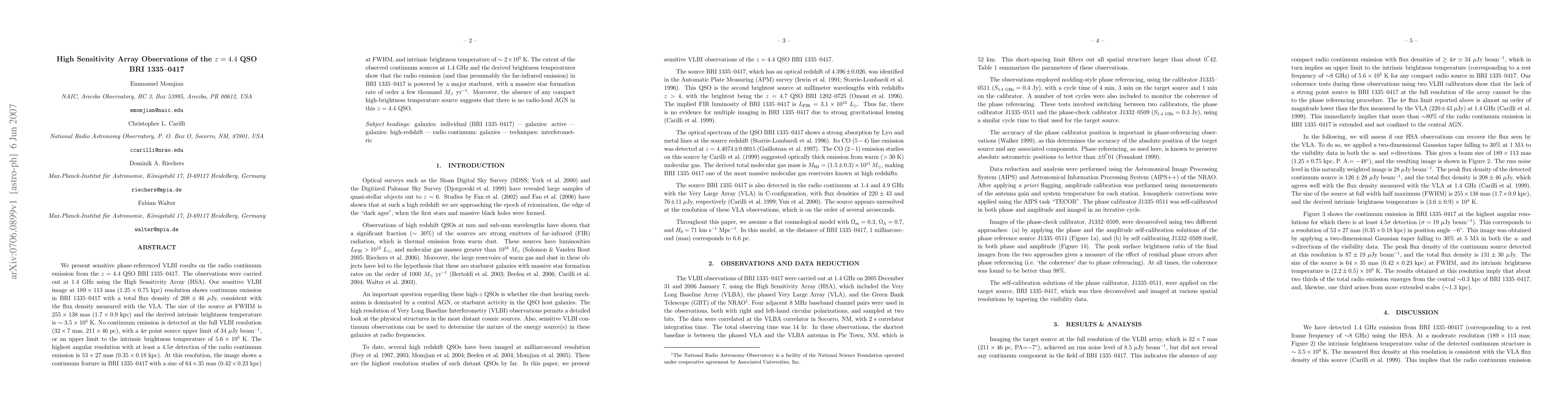 We present sensitive phase-referenced VLBI results on the radio continuum emission from the $z=4.4$ QSO BRI 1335--0417. The observations were carried out at 1.4 GHz using the High Sensitivity Array (HSA). Our sensitive VLBI image at $189 \times 113$ mas ($1.25 \times 0.75$ kpc) resolution shows continuum emission in BRI 1335--0417 with a total flux density of $208 \pm 46 \mu$Jy, consistent with the flux density measured with the VLA. The size of the source at FWHM is $255 \times 138$ mas ($1.7 \times 0.9$ kpc) and the derived intrinsic brightness temperature is $\sim 3.5\times 10^4$ K. No continuum emission is detected at the full VLBI resolution ($32 \times 7$ mas, $211 \times 46$ pc), with a 4$\sigma$ point source upper limit of 34 $\mu$Jy beam$^{-1}$, or an upper limit to the intrinsic brightness temperature of $5.6\times 10^5$ K. The highest angular resolution with at least a 4.5$\sigma$ detection of the radio continuum emission is $53 \times 27$ mas ($0.35 \times 0.18$ kpc). At this resolution, the image shows a continuum feature in BRI 1335--0417 with a size of $64 \times 35$ mas ($0.42 \times 0.23$ kpc) at FWHM, and intrinsic brightness temperature of $\sim 2\times 10^5$ K. The extent of the observed continuum sources at 1.4 GHz and the derived brightness temperatures show that the radio emission (and thus presumably the far-infrared emission) in BRI 1335--0417 is powered by a major starburst, with a massive star formation rate of order a few thousand M_{\odot} {\rm yr}^{-1}$. Moreover, the absence of any compact high-brightness temperature source suggests that there is no radio-loud AGN in this $z=4.4$ QSO.