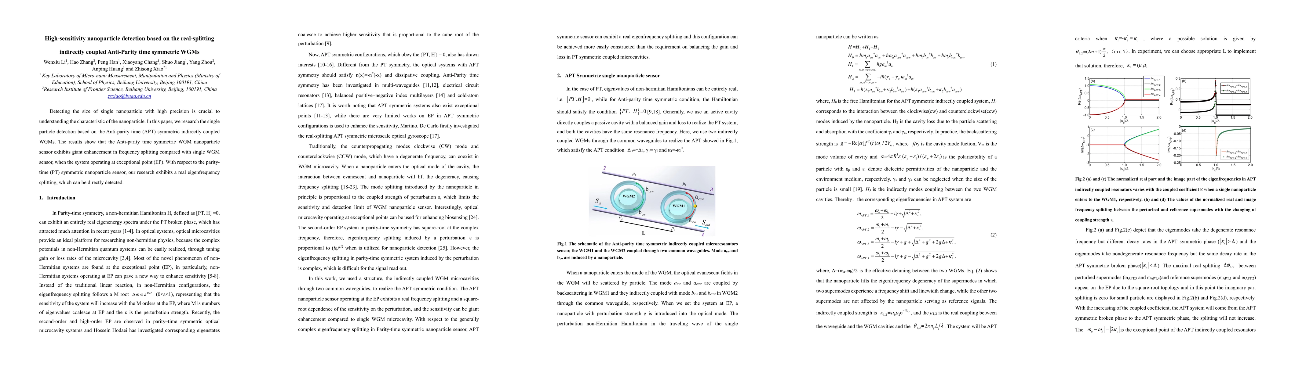 This paper presents a high-sensitivity bio-sensor utilizing Anti-parity time symmetric (APT) indirectly coupled whispering gallery modes (WGMs) to detect single nanoparticles, showing significantly enhanced frequency splitting at the exceptional point (EP) compared to conventional WGM sensors. The sensor exhibits real eigenfrequency splitting, providing a precise method for nanoparticle detection.