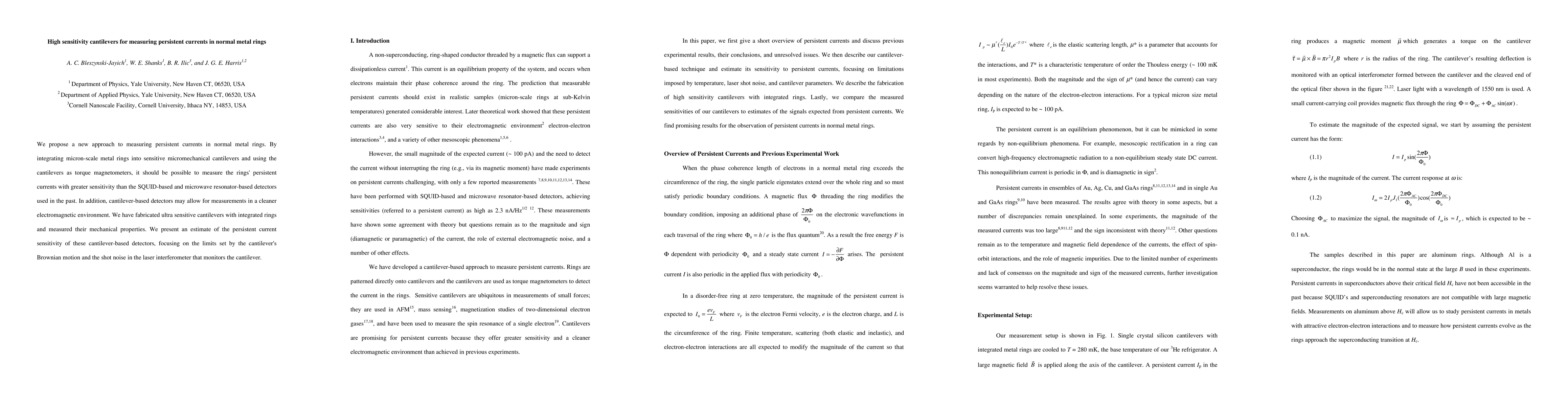 This paper proposes a novel method for measuring persistent currents in normal metal rings using high sensitivity cantilevers integrated with micron-scale metal rings, which act as torque magnetometers. The study estimates the sensitivity of these cantilever-based detectors, highlighting improvements over previous methods and potential for cleaner electromagnetic measurements.