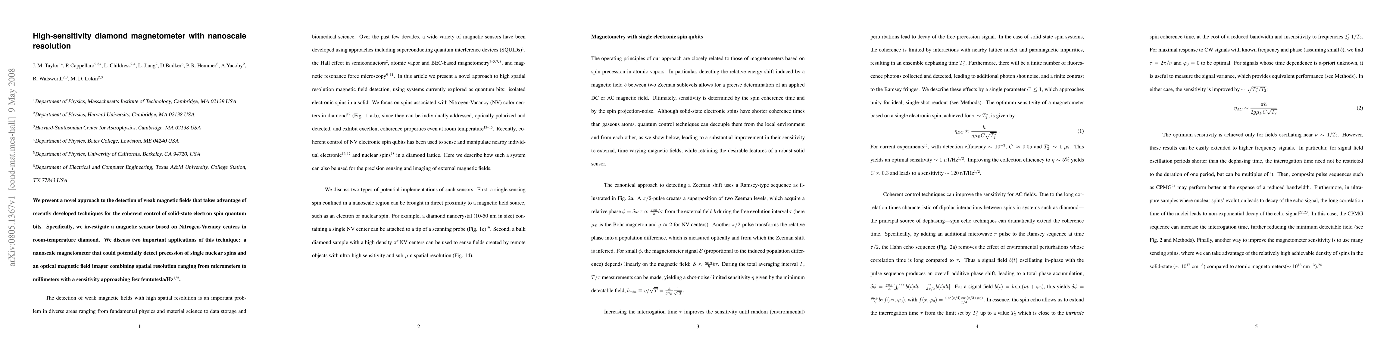 This paper introduces a high-sensitivity diamond magnetometer utilizing Nitrogen-Vacancy centers for detecting weak magnetic fields, achieving nanoscale resolution and sensitivity down to few femtotesla/Hz$^{1/2}$. Its applications include detecting single nuclear spin precession and creating optical magnetic field images with micrometer to millimeter resolution.