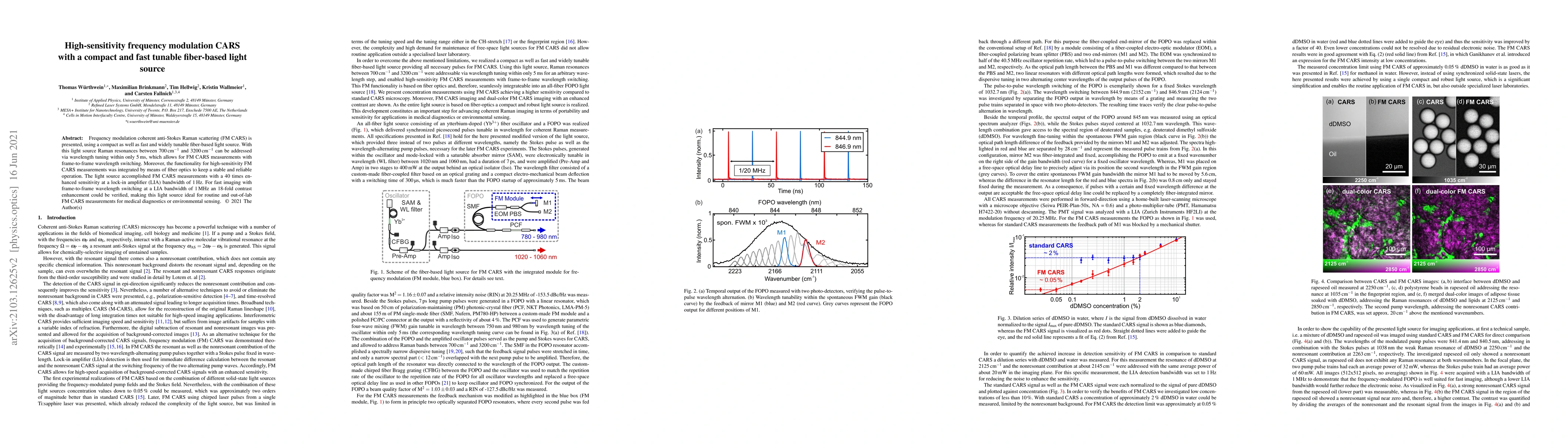 Frequency modulation coherent anti-Stokes Raman scattering (FM CARS) is presented, using a compact as well as fast and widely tunable fiber-based light source. With this light source Raman resonances between 700 cm$^{-1}$ and 3200 cm$^{-1}$ can be addressed via wavelength tuning within only 5 ms, which allows for FM CARS measurements with frame-to-frame wavelength switching. Moreover, the functionality for high-sensitivity FM CARS measurements was integrated by means of fiber optics to keep a stable and reliable operation. The light source accomplished FM CARS measurements with a 40 times enhanced sensitivity at a lock-in amplifier (LIA) bandwidth of 1 Hz. For fast imaging with frame-to-frame wavelength switching at a LIA bandwidth of 1 MHz a 18-fold contrast enhancement could be verified, making this light source ideal for routine and out-of-lab FM CARS measurements for medical diagnostics or environmental sensing.