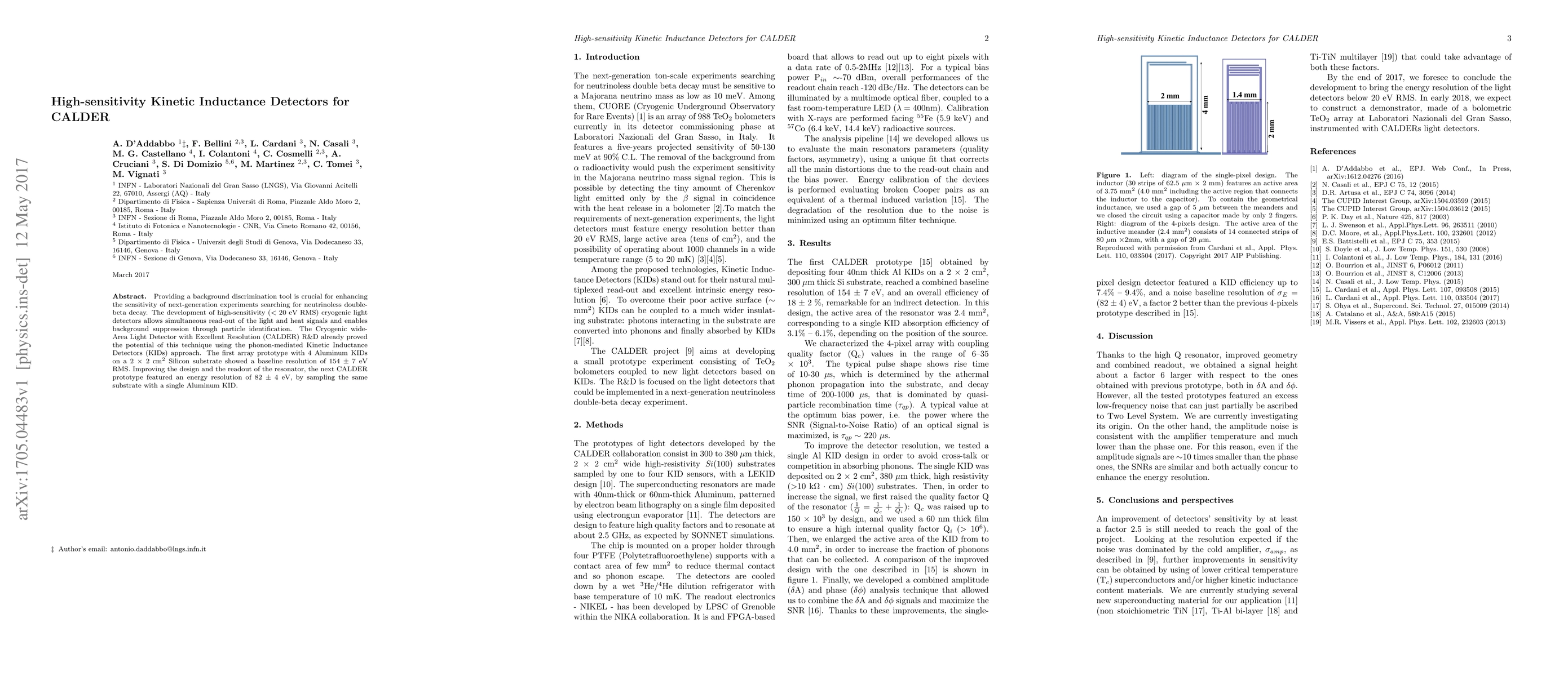 Providing a background discrimination tool is crucial for enhancing the sensitivity of next-generation experiments searching for neutrinoless double- beta decay. The development of high-sensitivity (< 20 eV RMS) cryogenic light detectors allows simultaneous read-out of the light and heat signals and enables background suppression through particle identification. The Cryogenic wide- Area Light Detector with Excellent Resolution (CALDER) R&D already proved the potential of this technique using the phonon-mediated Kinetic Inductance Detectors (KIDs) approach. The first array prototype with 4 Aluminum KIDs on a 2 $\times$ 2 cm2 Silicon substrate showed a baseline resolution of 154 $\pm$ 7 eV RMS. Improving the design and the readout of the resonator, the next CALDER prototype featured an energy resolution of 82 $\pm$ 4 eV, by sampling the same substrate with a single Aluminum KID.