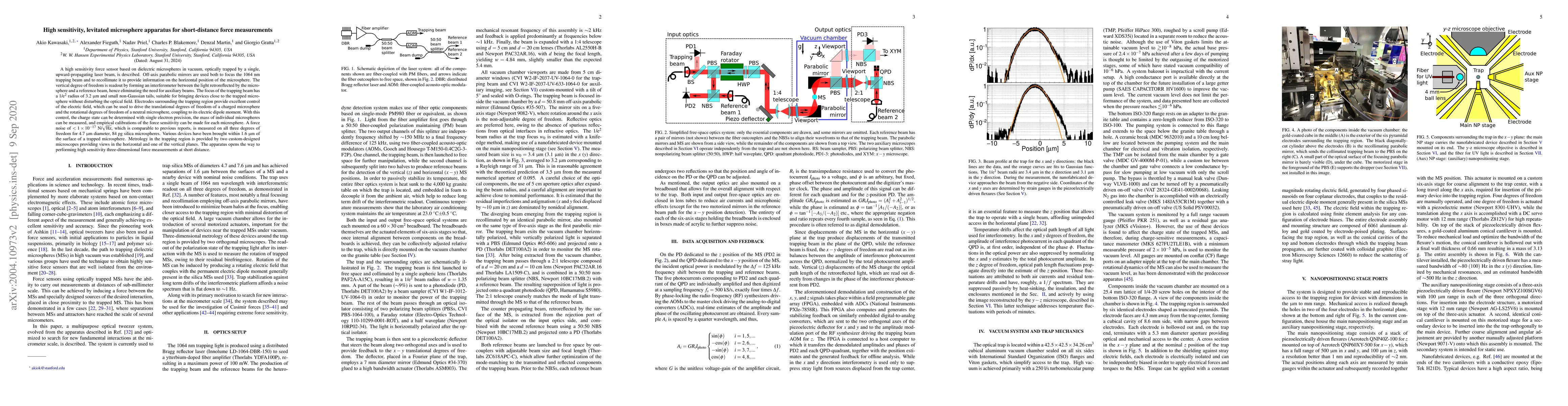 A high sensitivity force sensor based on dielectric microspheres in vacuum, optically trapped by a single, upward-propagating laser beam, is described. Off-axis parabolic mirrors are used both to focus the 1064~nm trapping beam and to recollimate it to provide information on the horizontal position of the microsphere. The vertical degree of freedom is readout by forming an interferometer between the light retroreflected by the microsphere and a reference beam, hence eliminating the need for auxiliary beams. The focus of the trapping beam has a 1/e$^2$ radius of 3.2~$\mu$m and small non-Gaussian tails, suitable for bringing devices close to the trapped microsphere without disturbing the optical field. Electrodes surrounding the trapping region provide excellent control of the electric field, which can be used to drive the translational degrees of freedom of a charged microsphere and the rotational degrees of freedom of a neutral microsphere, coupling to its electric dipole moment. With this control, the charge state can be determined with single electron precision, the mass of individual microspheres can be measured, and empirical calibrations of the force sensitivity can be made for each microsphere. A force noise of $<1\times10^{-17}$~N/$\sqrt{\rm Hz}$, which is comparable to previous reports, is measured on all three degrees of freedom for 4.7~$\mu$m diameter, 84~pg silica microspheres. Various devices have been brought within $1.6~\mu$m of the surface of a trapped microsphere. Metrology in the trapping region is provided by two custom-designed microscopes providing views in the horizontal and one of the vertical planes. The apparatus opens the way to performing high sensitivity three-dimensional force measurements at short distance.
