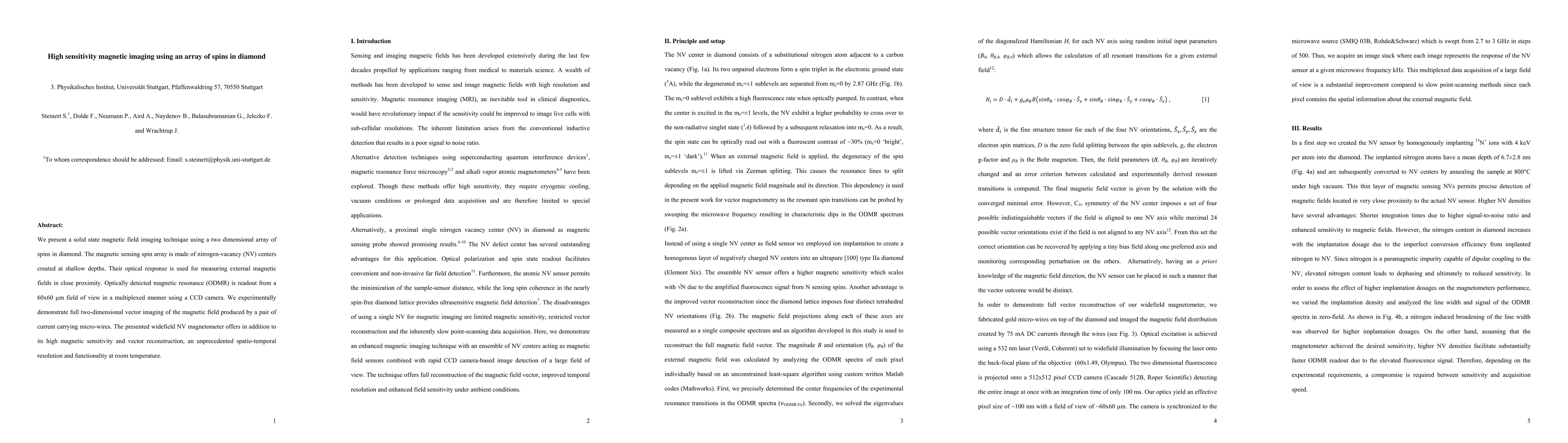 This paper introduces a high-sensitivity magnetic imaging technique utilizing a two-dimensional array of nitrogen-vacancy centers in diamond for solid-state magnetic field sensing. The method employs optically detected magnetic resonance and demonstrates full two-dimensional vector imaging with high sensitivity and resolution at room temperature.