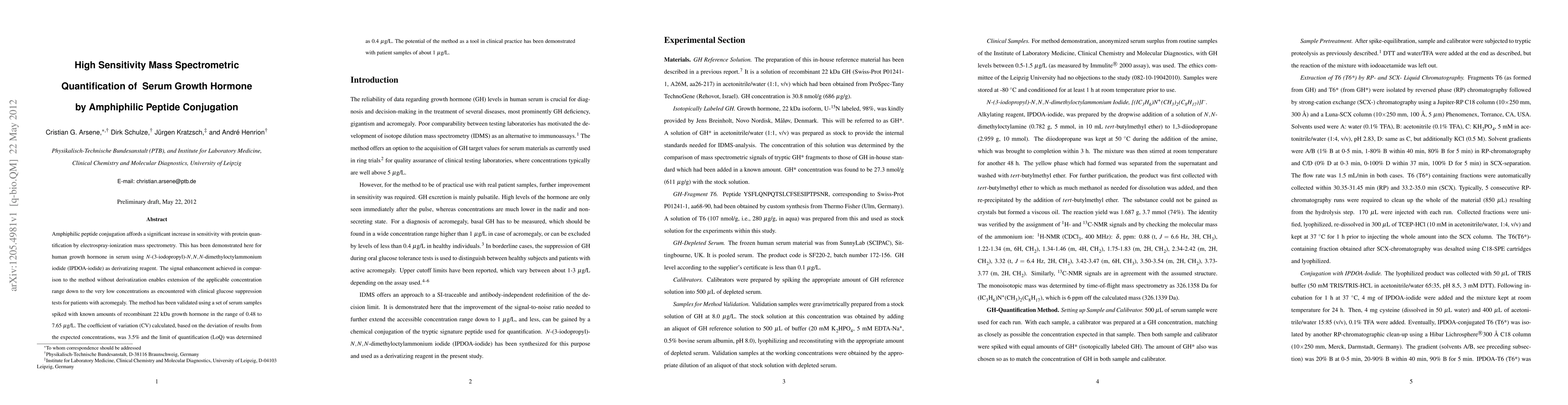 This study enhances the sensitivity of electrospray-ionization mass spectrometry for quantifying human growth hormone in serum using amphiphilic peptide conjugation with IPDOA-iodide. The method achieves a limit of quantification of 0.4 µg/L and a coefficient of variation of 3.5%, demonstrating its potential for clinical use in detecting low hormone concentrations.