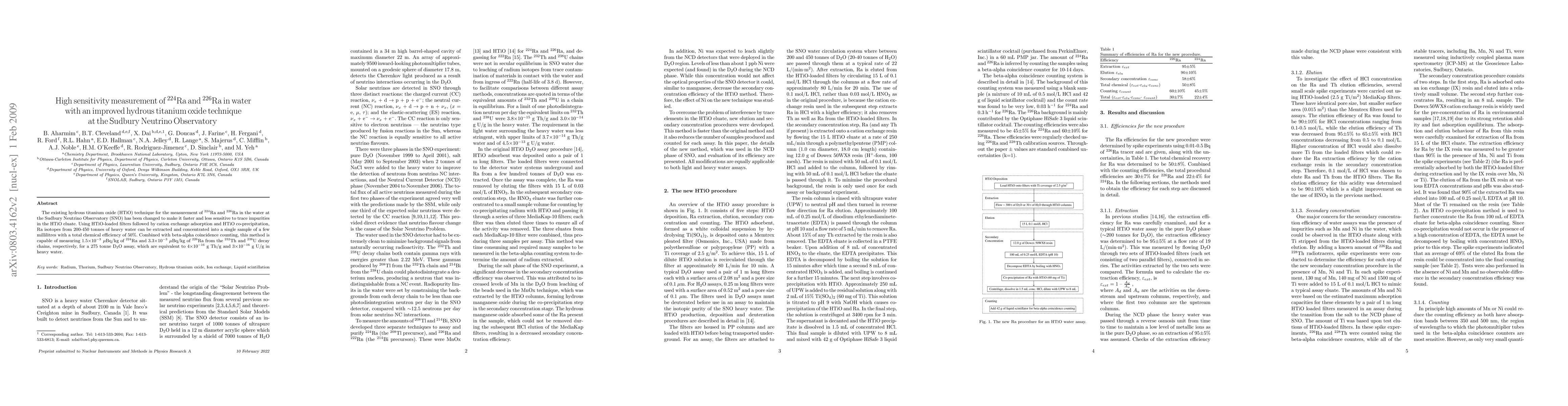 The existing hydrous titanium oxide (HTiO) technique for the measurement of 224Ra and 226Ra in the water at the Sudbury Neutrino Observatory (SNO) has been changed to make it faster and less sensitive to trace impurities in the HTiO eluate. Using HTiO-loaded filters followed by cation exchange adsorption and HTiO co-precipitation, Ra isotopes from 200-450 tonnes of heavy water can be extracted and concentrated into a single sample of a few millilitres with a total chemical efficiency of 50%. Combined with beta-alpha coincidence counting, this method is capable of measuring 2.0x10^3 uBq/kg of 224Ra and 3.7x10^3 uBq/kg of 226Ra from the 232Th and 238U decay chains, respectively, for a 275 tonne D2O assay, which are equivalent to 5x10^16 g Th/g and 3x10^16 g U/g in heavy water.