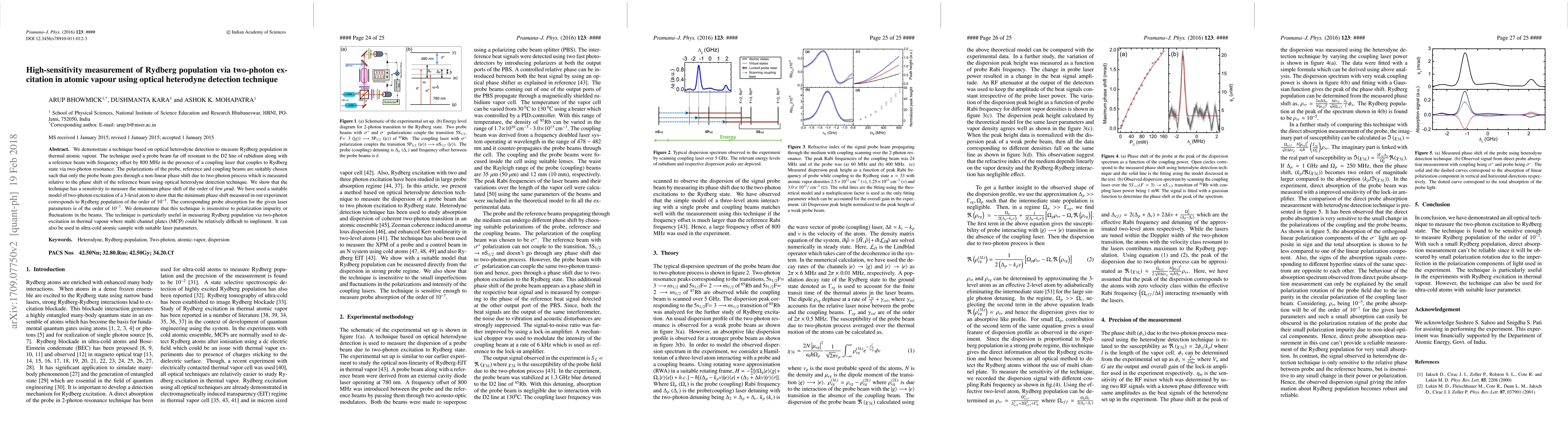 We demonstrate a technique based on optical heterodyne detection to measure Rydberg population in thermal atomic vapour. The technique used a probe beam far off resonant to the D2 line of rubidium along with a reference beam with frequency offset by 800 MHz in the presence of a coupling laser that couples to Rydberg state via two-photon resonance. The polarizations of the probe, reference and coupling beams are suitably chosen such that only the probe beam goes through a non-linear phase shift due to two-photon process which is measured relative to the phase shift of the reference beam using optical heterodyne detection technique. We show that the technique has a sensitivity to measure the minimum phase shift of the order of few $\mu$rad. We have used a suitable model of two-photon excitation of a 3-level atom to show that the minimum phase shift measured in our experiment corresponds to Rydberg population of the order of $10^{-5}$. The corresponding probe absorption for the given laser parameters is of the order of $10^{-7}$. We demonstrate that this technique is insensitive to polarization impurity or fluctuations in the beams. The technique is particularly useful in measuring Rydberg population via two-photon excitation in thermal vapour where multi channel plates (MCP) could be relatively difficult to impliment. It can also be used in ultra-cold atomic sample with suitable laser parameters.