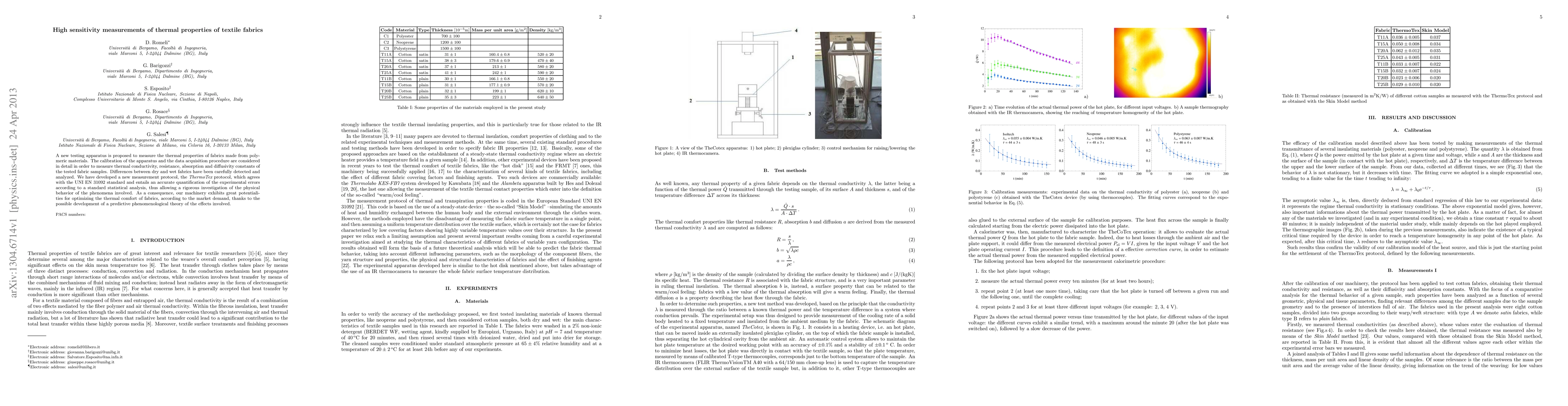 A new testing apparatus is proposed to measure the thermal properties of fabrics made from polymeric materials. The calibration of the apparatus and the data acquisition procedure are considered in detail in order to measure thermal conductivity, resistance, absorption and diffusivity constants of the tested fabric samples. Differences between dry and wet fabrics have been carefully detected and analyzed. We have developed a new measurement protocol, the "ThermoTex" protocol, which agrees with the UNI EN 31092 standard and entails an accurate quantification of the experimental errors according to a standard statistical analysis, thus allowing a rigorous investigation of the physical behavior of the phenomena involved. As a consequence, our machinery exhibits great potentialities for optimizing the thermal comfort of fabrics, according to the market demand, thanks to the possible development of a predictive phenomenological theory of the effects involved.