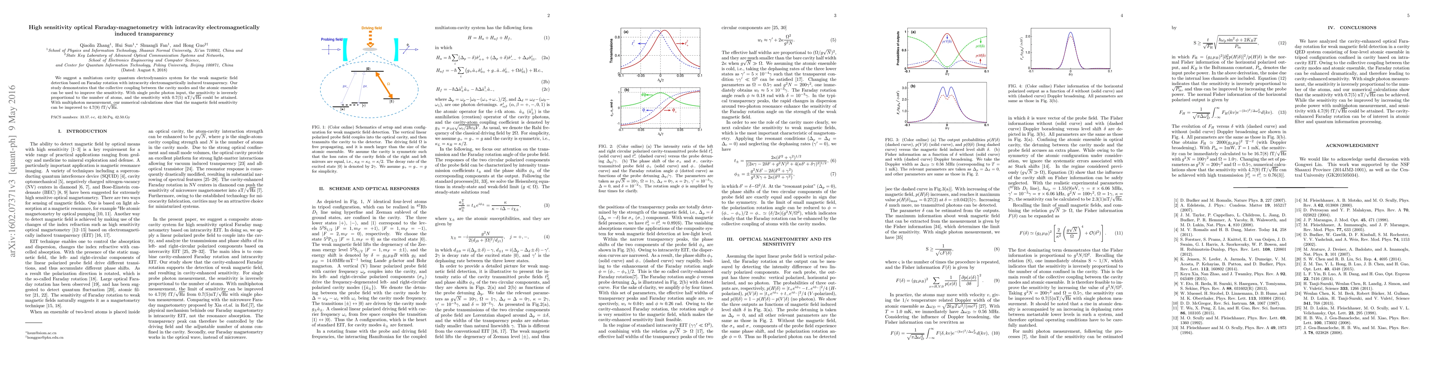 The paper proposes a multiatom cavity quantum electrodynamics system for detecting weak magnetic fields using Faraday rotation and intracavity electromagnetically induced transparency, achieving a sensitivity of 0.7(5) nT/$\sqrt{\rm Hz}$ with single-photon input and up to 4.7(9) fT/$\sqrt{\rm Hz}$ with multiphoton measurements.
